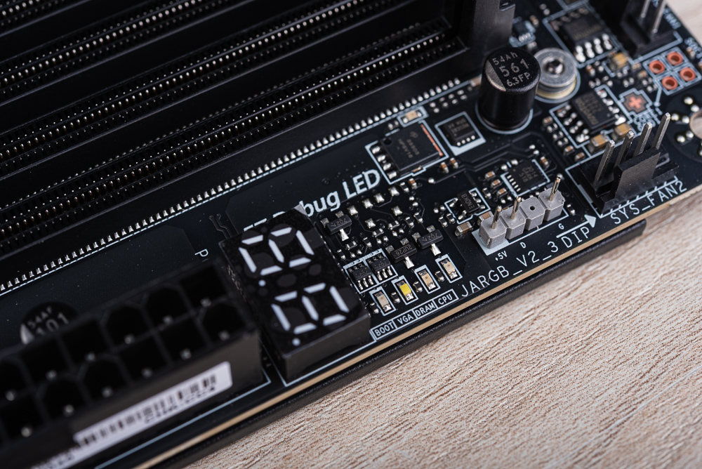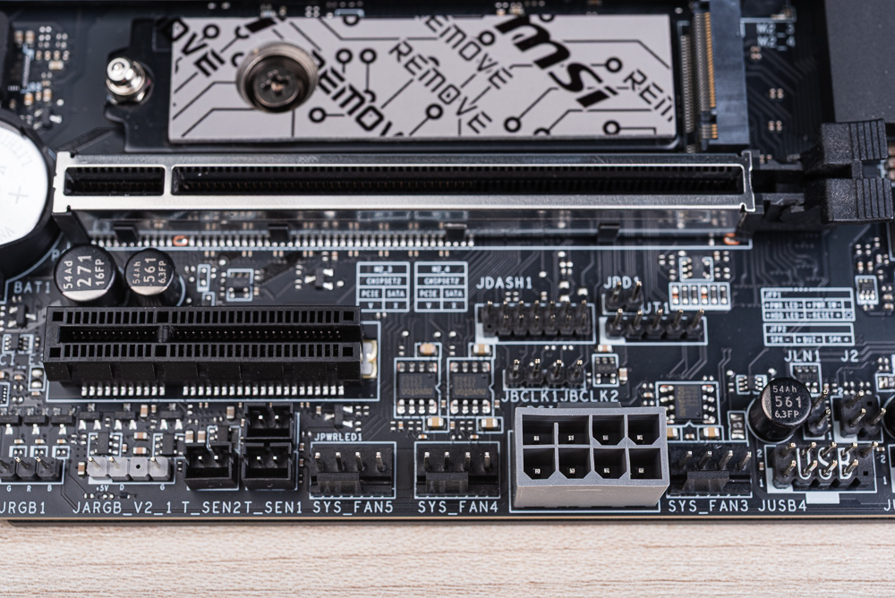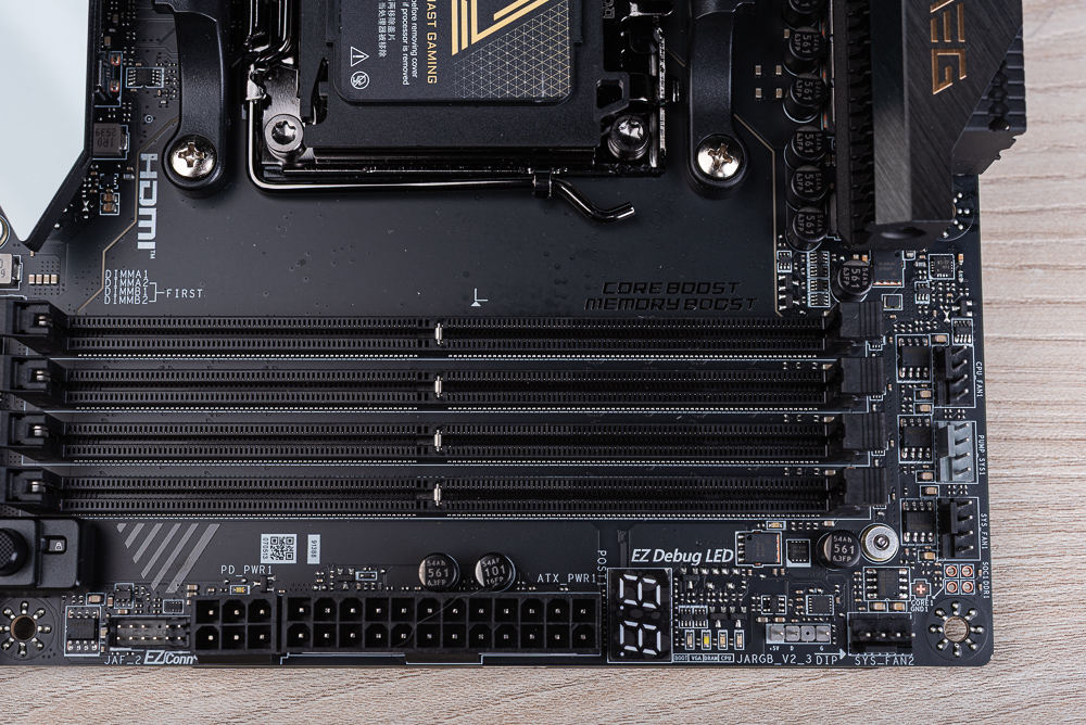 而在 MB 24pin 供電插座的右手邊,則有著 EZ Debug LED 與 POST Code,方便玩家瞭解目前開機時的檢查狀況。另一邊則有著 PD_PWR1 與 JAF_2 EZ Conn 元件。PD_PWR1 可連接 PCIe 6pin 供電,用來提供前置 USB-C 60W 快充功能;而 JAF_2 EZ Conn 是 MSI 定義的特殊接頭,可藉由配件中的線材轉成包含 ARGB、FAN、USB 2.0 擴充的連接線。