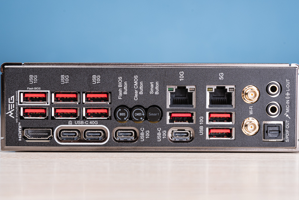 主板後 I/O 採用一體式檔板,有著 Flash BIOS 按鈕、Clear CMOS 按鈕與可自訂功能的 Smart 按鈕,並有著 2 個 USB4 Type-C 支援 DP 顯示輸出,再加上 1 個 HDMI 2.1 FRL 最多連接 3 個螢幕。