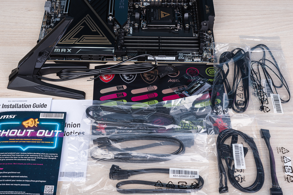 配件方面 X870E ACE MAX 也相當齊全,有著便利的整線標籤貼紙,以及基本的 SATA 線材、EZ M.2 CLIP II 解鎖工具、USB 隨身碟、JAF_2 擴充線、RGB 延長線、溫度偵測線,以及便利的 Wi-Fi EZ 天線。