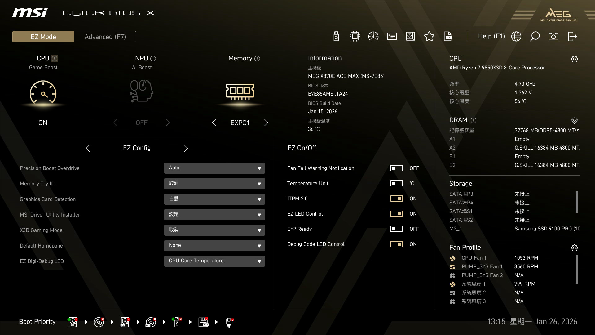 BIOS 方面 MEG X870E ACE MAX 提供相當多的功能讓玩家自行探索,在 EZ Mode 當中可直接開啟 CPU Game Boost、Memory EXPO 參數,以及快速的 EZ Config、On/Off 等設定,以及完整的 CPU、DRAM、STROAGE、FAN 等監控資訊,都可在 EZ Mode 中直接調整。