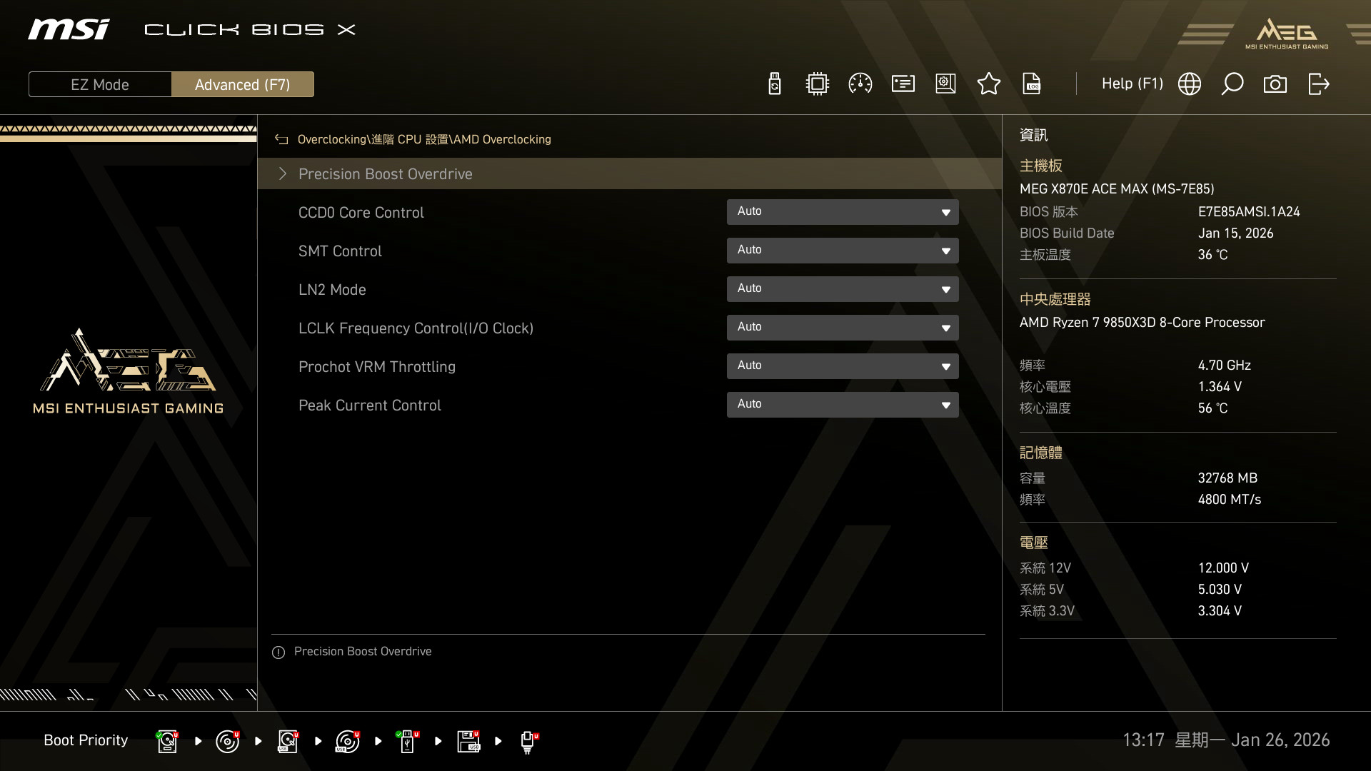 選擇 AMD Overclocking 後則包含 Precision Boost Overdrive、CCDo 核心設定、SMT、LN2 等設定。再選擇 Precision Boost Overdrive 後,就會有相當多 MSI 提供給玩家的超頻功能,像是基本的 PBO Enhanced 模式、Set Thermal Point 溫度上限、Enhanced Boost 與 PRO BCLK Booster 等設定。