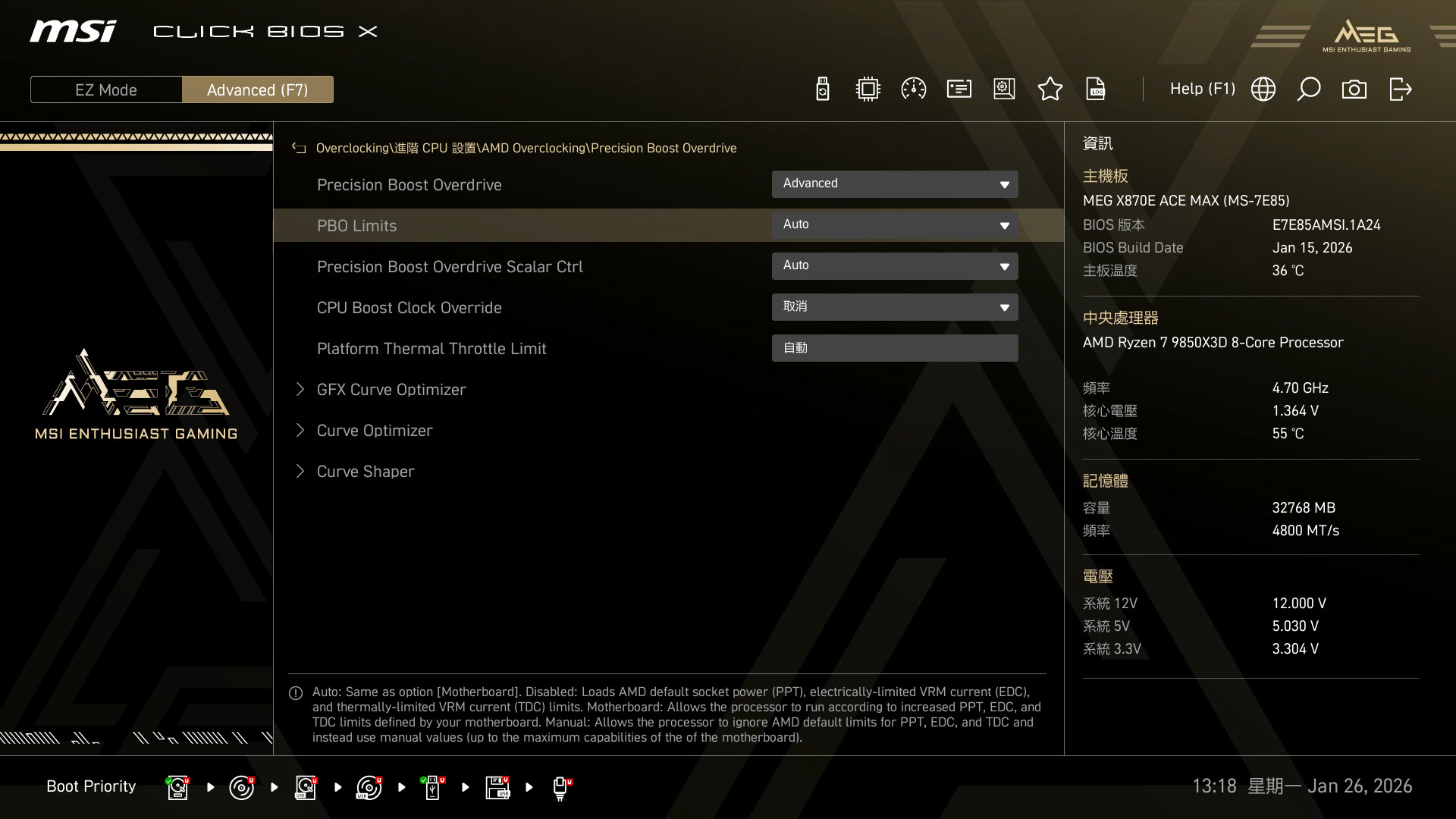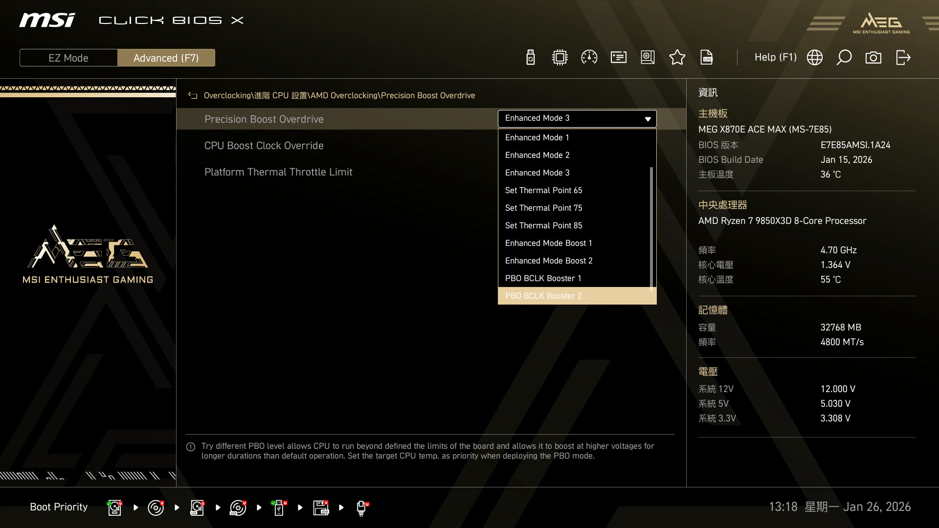 玩家可自行選擇所需的 PBO 模式來超頻,或者直接設定為 Advance 模式,自訂 PBO 限制與 Override 的時脈上限等設定。
