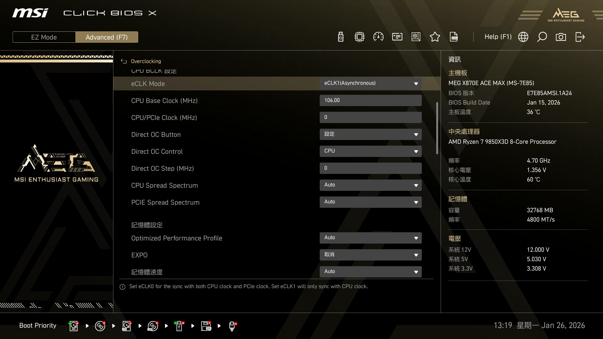 像是選擇 PRO BCLK Booster 後,CPU BCLK 就會設定為 eCLK1(Asynchronous) 非同步,讓 CPU BCLK 小超 106 MHz,而 PCIe 則維持不變。