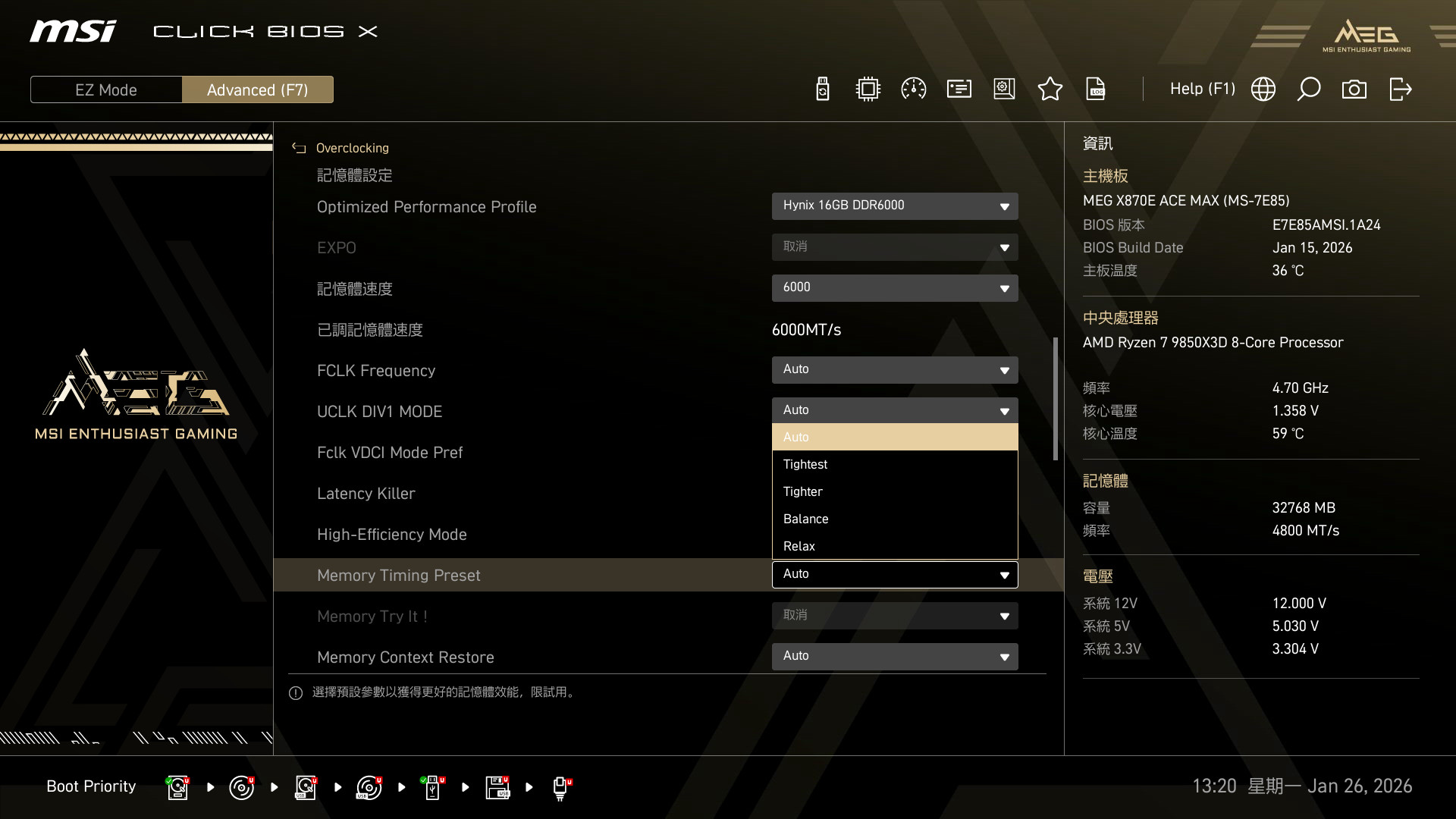 記憶體超頻方面,MSI 會提供針對記憶體顆粒的優化設定檔,像是測試使用 Hynix 16GB DDR6000 的設定,而且還有著 Latency Killer 降低延遲、High-Efficiency 提高頻寬,以及記憶體時序微調等功能,讓玩家