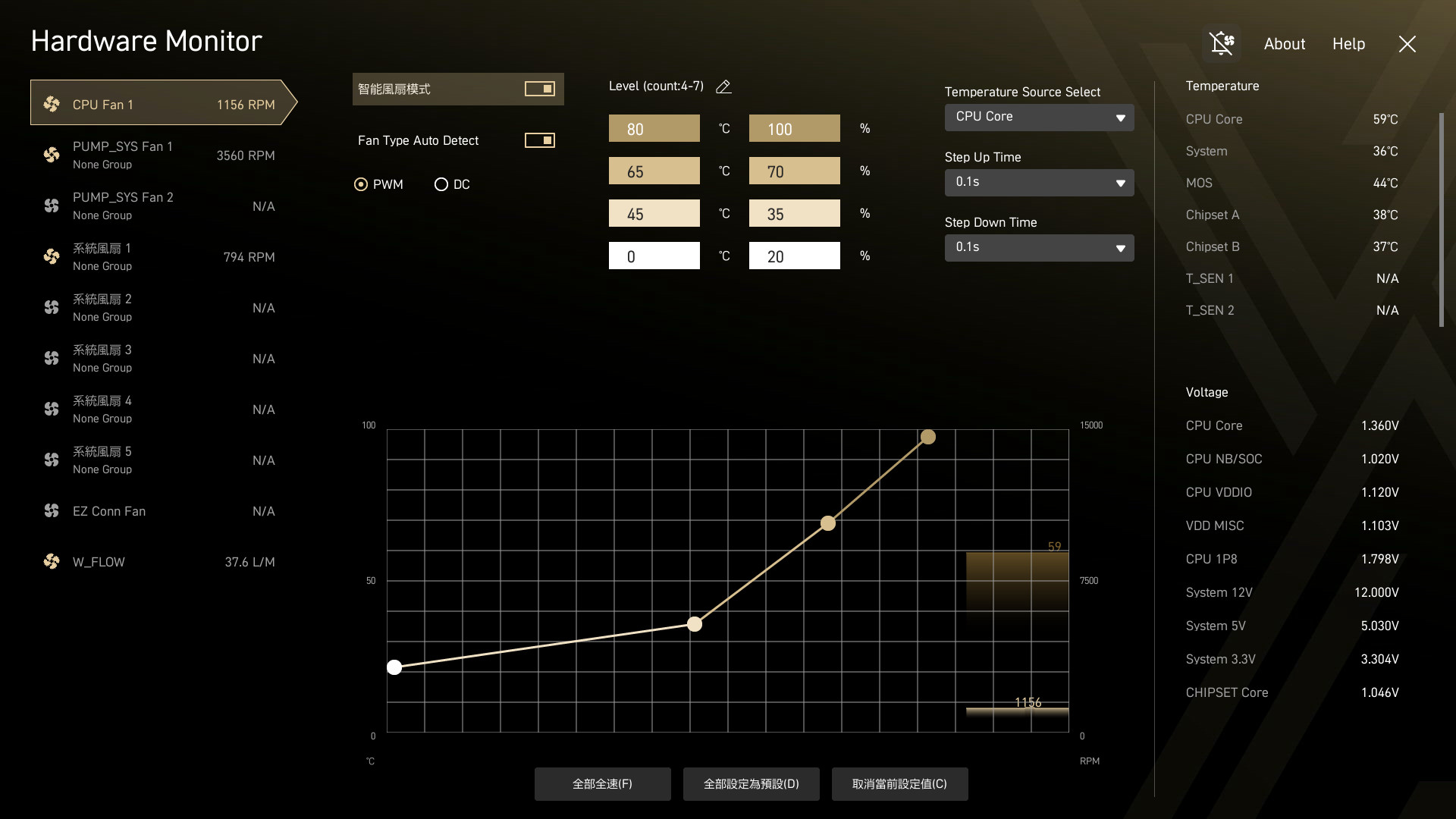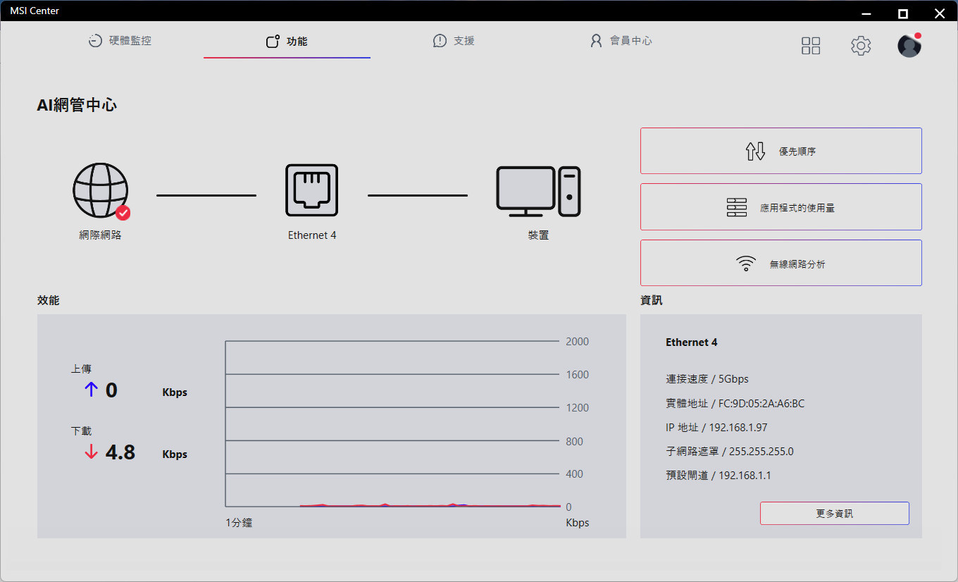 Cooling Wizard 則可自定義風扇轉速,並有多個配置文件可設定不同的風扇曲線設定。AI 網管中心,則可幫忙監控目前的網路流量資訊、優先順序、使用量與無線網路分析。