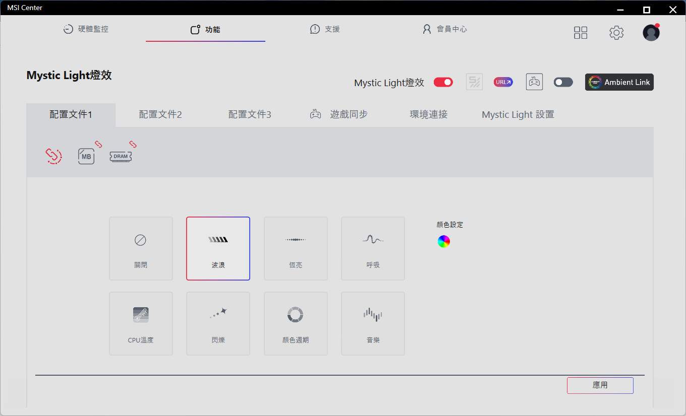 燈效方面,可通過 Mystic Light 同步主板、記憶體,有著波浪、恆亮、呼吸、CPU 溫度、閃爍、顏色週期、音樂等多種燈效模式,亦可與遊戲同步、環境連接等功能。