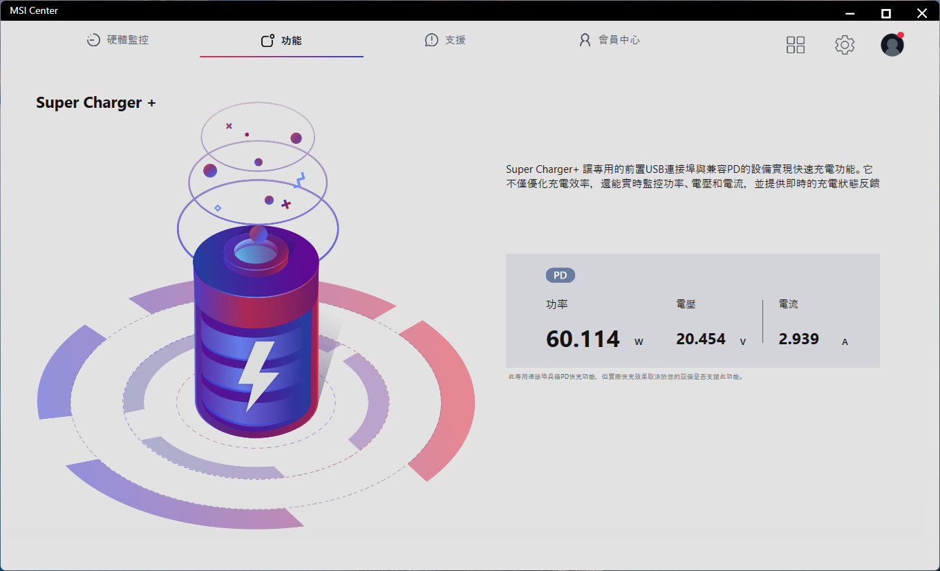 MEG X870E ACE MAX 主板前置 USB-C 提供最高 60W 快充功能,在 Super Charger 中也可檢視目前前置 USB-C 充電的功率、電壓與電流等資訊。