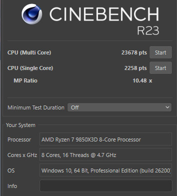 Ryzen 9 9850X3D 在 2026 版本獲得 CPU nT 5664 pts、1C 769 pts、1T 575 pts 的性能;R23 版本 CPU nT 233678 pts、1T 2258 pts 的成績。
