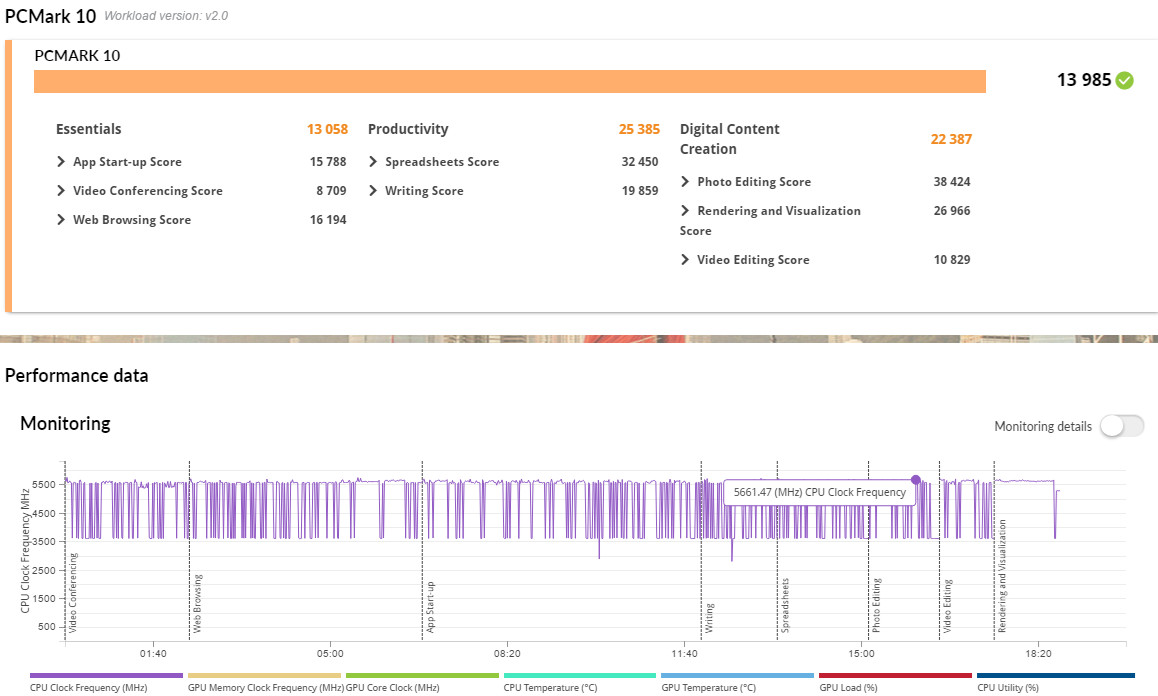 Ryzen 9 9850X3D 獲得了 13985 分,電腦基準性能 Essentials 有著 13058 分,生產力則有 25385 分,在更需要 CPU 運算的數位內容創造獲得 22387 分的高成績;記錄的資料顯示測試時 CPU 時脈最高達到 5.66GHz。