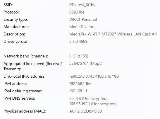 無線網路方面 MEG X870E ACE MAX 採用 MeditTek Wi-Fi 7 MT7927 320MHz 無線網路晶片,通過實際連上 Wi-Fi 7 無線網路 6GHz 頻段,最高理論傳輸值為 5764 Mbps。