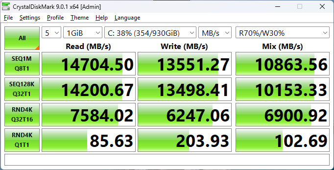 CrystalDiskMark 測試系統碟使用 SAMSUNG 9100 PRO 1TB,可達到循序讀寫 14704.5 MB/s、13551.2 MB/s 的傳輸效能。