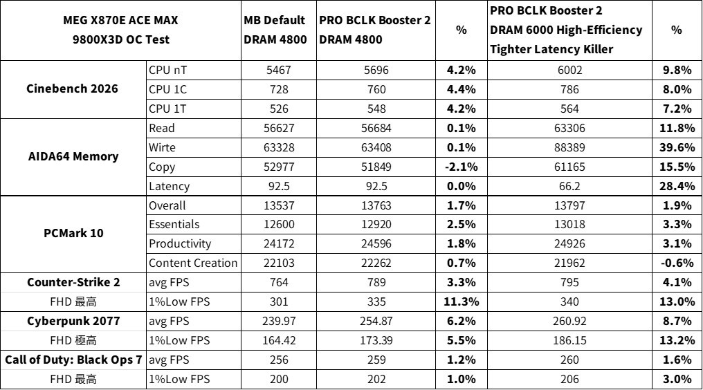效能測試方面,主要來挑戰主板提供的 PRO BCLK Booster 2,藉由提升 BLCK 105 MHz,以及針對記憶體的 High-Efficiency Tighter 高頻寬與 Latency Killer 低延遲的超頻測試。分別使用 Cinebench 2026、AIDA64 Memory、PCMark 10 與遊戲 Counter-Strike 2、Cyberpunk 2077 與 Call of Duty: Black Ops 7 進行測試。
