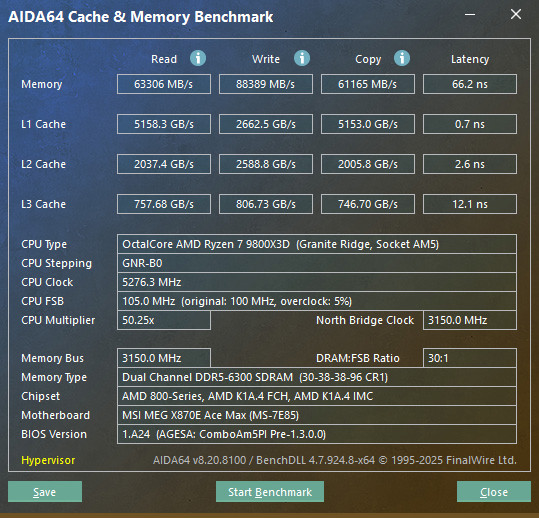 AID64 記憶體在預設 DRAM 4800 測試下,記憶體讀取 56627 MB/s、寫入 63328 MB/s、複製 52977 MB/s、延遲 92.5 ns;而在最終套用 DRAM 6000 High-Efficiency Tighter Latency Killer 設定下,提升至記憶體讀取 63306 MB/s、寫入 88389 MB/s、複製 61165 MB/s、延遲 66.2 ns;讓記憶體讀取提升 11.8%、寫入提升 39.6%、延遲降低 28.4%。