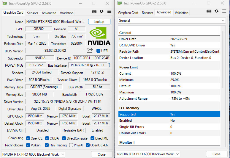 GPU-Z 檢視 NVIDIA RTX PRO™ 6000 Blackwell 工作站 GPU 資訊,採用 5nm 製程、NVIDIA Blackwell 架構 核心,使用 PCIe 5.0 x16 介面,有著 24064 個 CUDA 核心、98304 MB GDDR7 記憶體支援 ECC 功能,GPU 預設時脈 1590 MHz、Boost 時脈 2617 MHz;GPU 功耗限制最高 600W 上限。