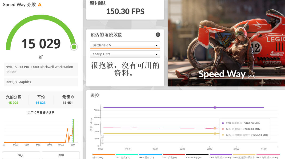 RTX PRO™ 6000 Blackwell 工作站 GPU,可達到 15029 分的成績,也就是平均 150.3 FPS 的影像順暢度。