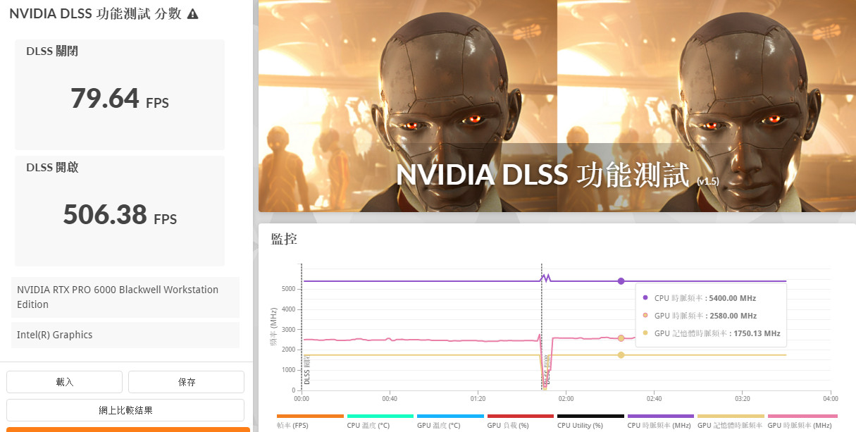 RTX PRO™ 6000 Blackwell 工作站 GPU,未開啟 DLSS 時原生渲染 79.64 FPS,開啟 DLSS 4 加速後可達到 506.38 FPS 的效能提升,約達到 6.3x 倍的效能升級。
