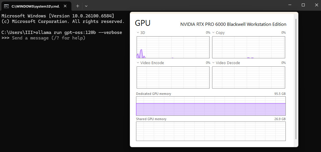 至於更高階的「gpt-oss-120b」模型則支援搭載 NVIDIA RTX PRO GPU 的專業工作站,而這也是本次 AI 大型 LLM 的測試重點,使用 Ollama 應用程式來部署 gpt-oss-120b 模型,並已針對 RTX GPU 最佳化。通過執行 gpt-oss-120b 模型需要佔用約 62.1 GB 的 GPU 記憶體,這遠超一般桌上型 GPU 記憶體容量的範疇。