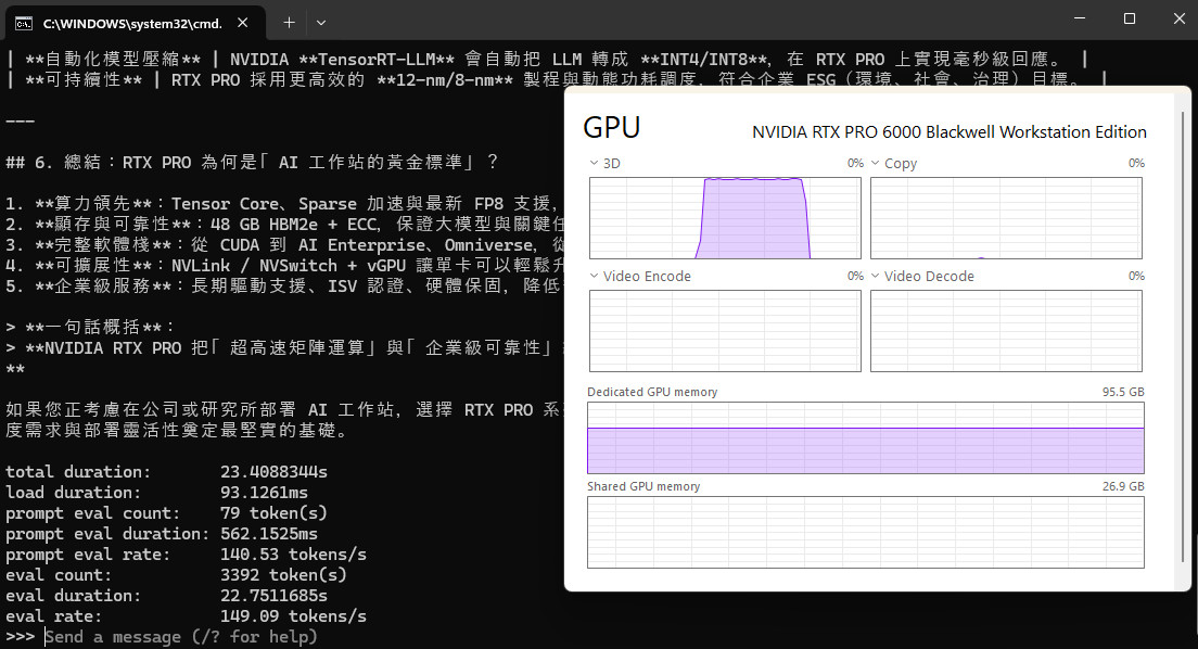 嘗試輸入 Prompt:說說 NVIDIA RTX PRO 在 AI 領域的重要性。通過 RTX PRO™ 6000 Blackwell 工作站 GPU 加速,LLM 模型通過提字、思考後花費 23.4s 秒完成輸出,這組 Prompt 約 79 token(s),推論輸出 3392 token(s)、花費 22.7s 秒的時間,推論速率約在每秒 149.09 tokens/s。