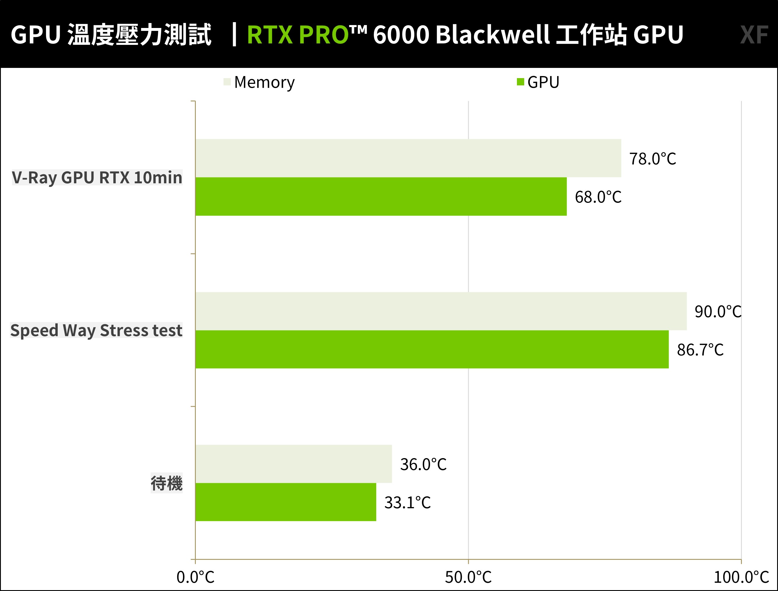 RTX PRO™ 6000 Blackwell 工作站 GPU,待機時溫度僅 33.1°C,通過 Speed Way 壓力測試時 GPU 溫度 86.7°C、記憶體 90°C;而 V-Ray GPU RTX 10min 測試時 GPU 僅 68°C、記憶體 78°C。