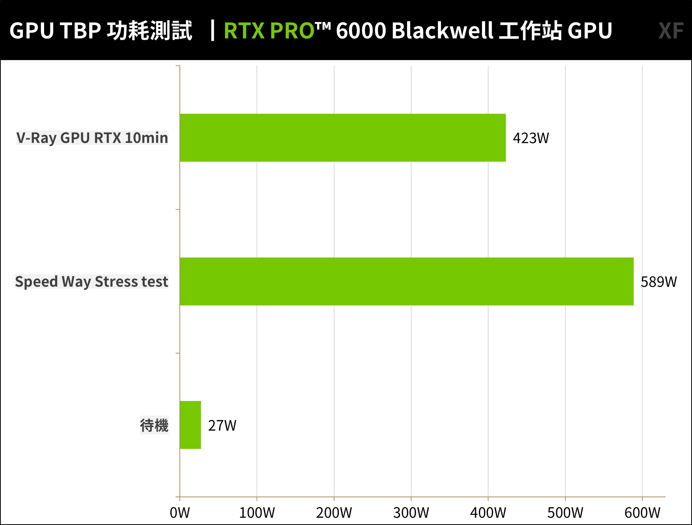 功耗方面 RTX PRO™ 6000 Blackwell 工作站 GPU,在光線追蹤渲染測試下達到最高平均 589W 功耗、記錄最高則是 600W;而 V-Ray 測試時則在 423W 左右。