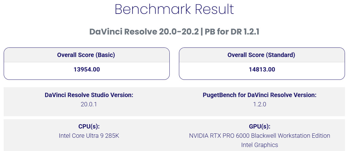 RTX PRO™ 6000 Blackwell 工作站 GPU 獲得基本 13954、標準 14813 分的總成績,這性能在 PugetBench 資料庫中搖搖領先,相差第一名在於 CPU 等級而非 GPU。
