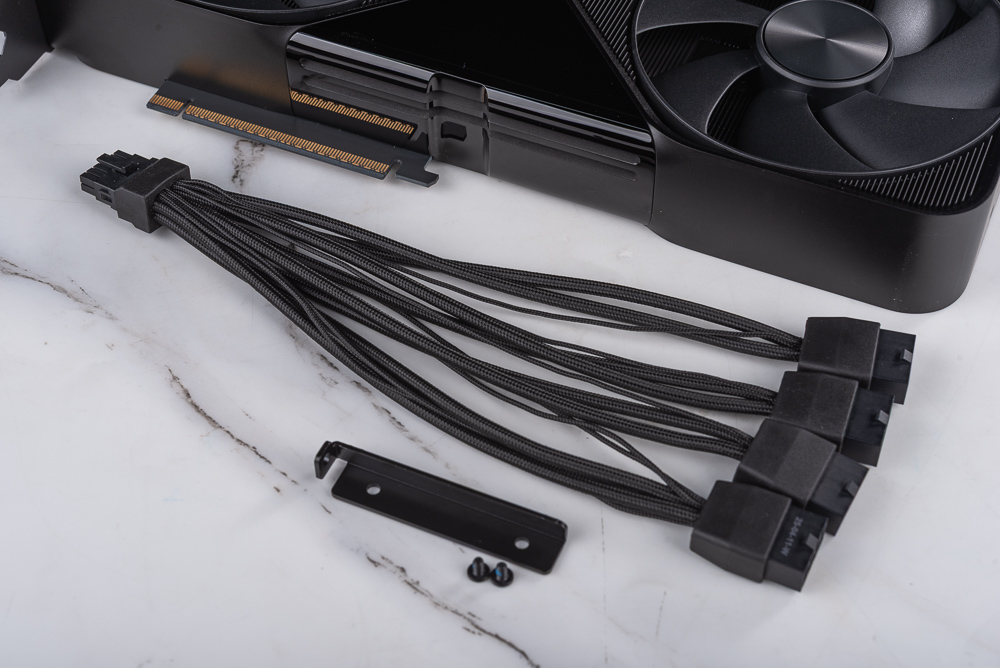 ↑ 顯卡配件則提供 PCIe Gen5 外接電源轉接線與固定支架含螺絲。