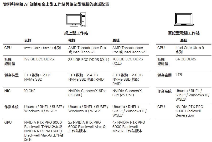 ↑ 資料科學和 AI 訓練用桌上型工作站建議配置表。資料來源:NVIDIA 官網。