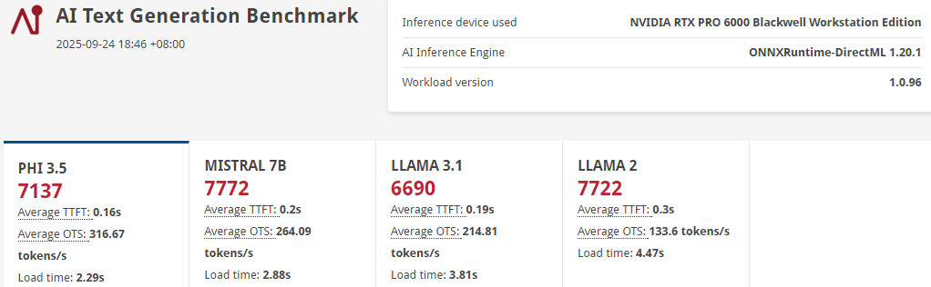 RTX PRO™ 6000 Blackwell 工作站 GPU 採用 ONNX DirectML 推論引擎,在 PHI 3.5 模型達到 7137分、TTFT 0.16s、OTS 316.67 tokens/s;MISTRAL 7B 模型 7772 分、TTFT 0.2s、OTS 264.09 tokens/s;LLAMA 3.1 獲得 6690 分、TTFT 0.19s、OTS 214.81 tokens/s;LLAMA 2 獲得 7722 分、TTFT 0.3s、OTS 133.6 tokens/s。