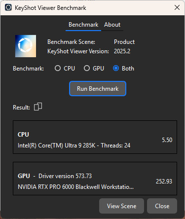 KeyShot 是由 Luxion 所開發的 3D 渲染軟體,能夠快速的建立逼真的 3D 模型影像,並以直覺的介面與即時渲染而出名。KeyShot 預設使用 CPU 進行渲染並支援 GPU 加速渲染等功能,在 KeyShot Viewer 當中提供 Benchmark 功能。KeyShot Benchmark 基準分為 1,測試分數越高代表性能越好。