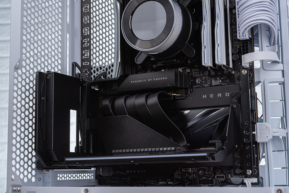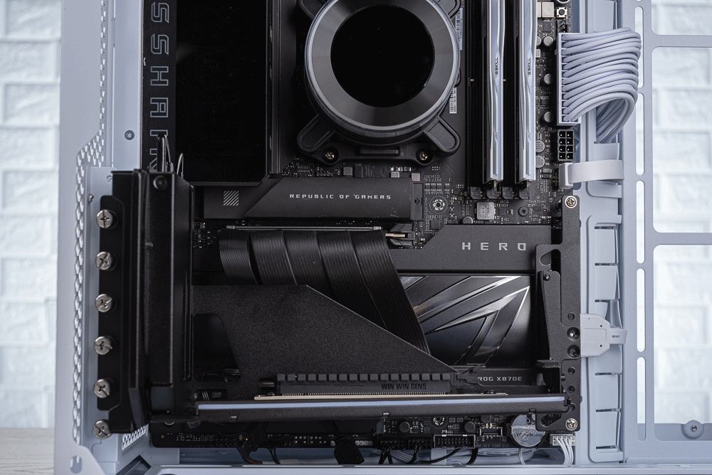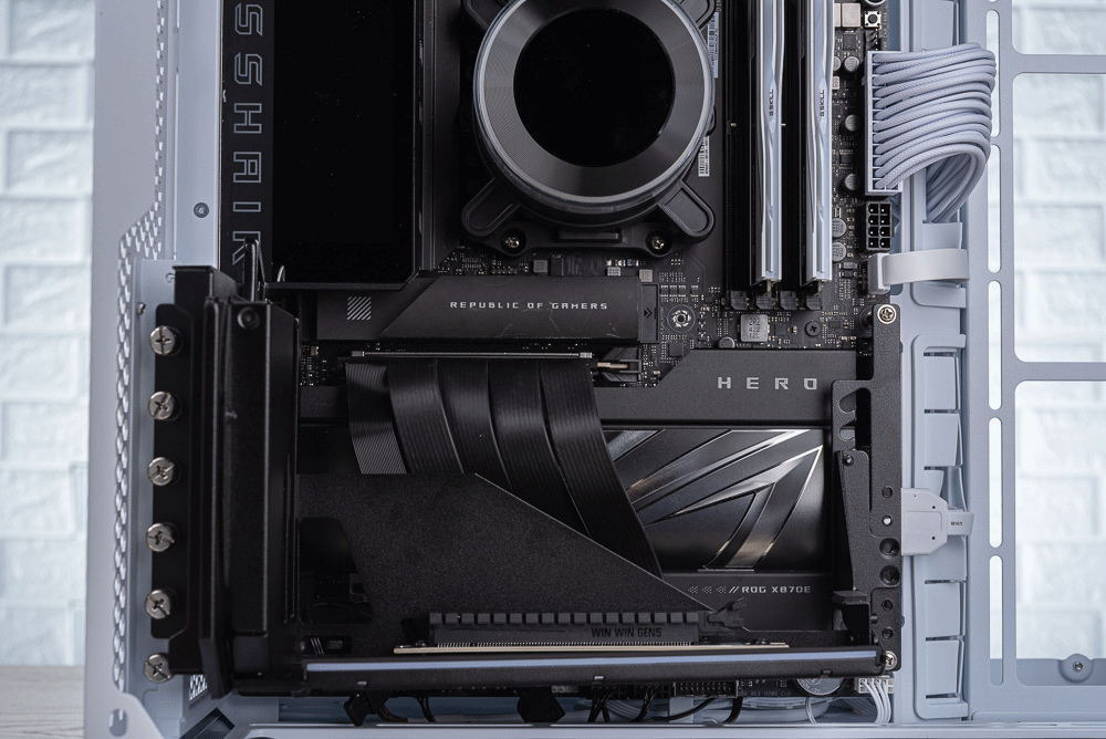 換句話說,玩家的 ATX 中塔機殼除了要具備 6 槽以上的 PCIe 安裝空間,而且機殼 PCIe 檔板往外至玻璃側透的這段距離至少要 50mm 以上的深度,才適合使用這款垂直顯卡支架。另外,玩家搭配的顯卡高度也需要注意,以免跟 CPU 散熱器的水冷頭發生衝突,而使用垂直顯卡的玩家基本與空冷塔扇無緣。
