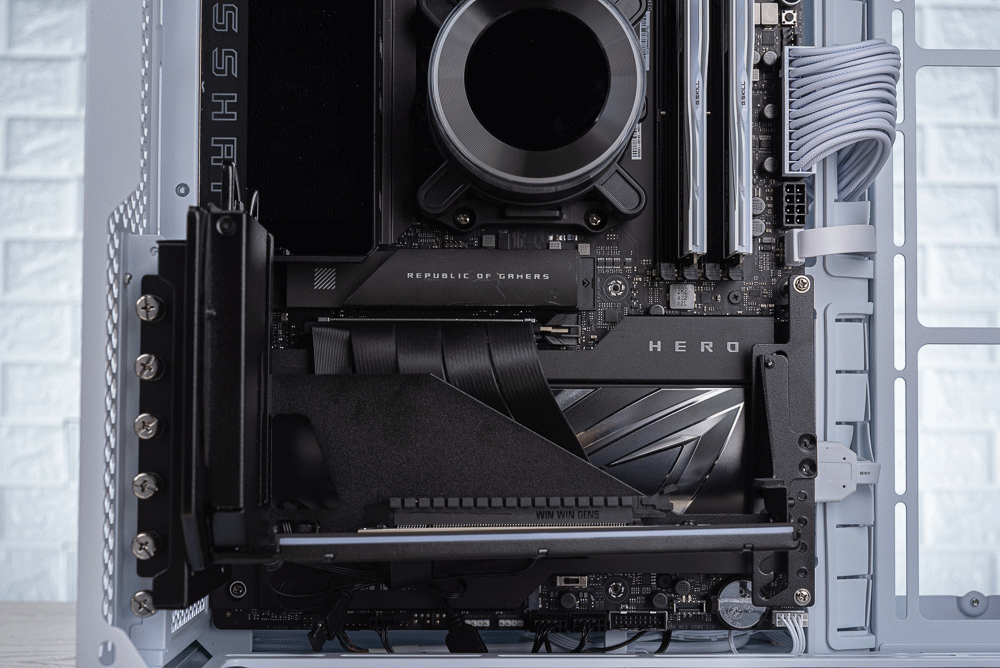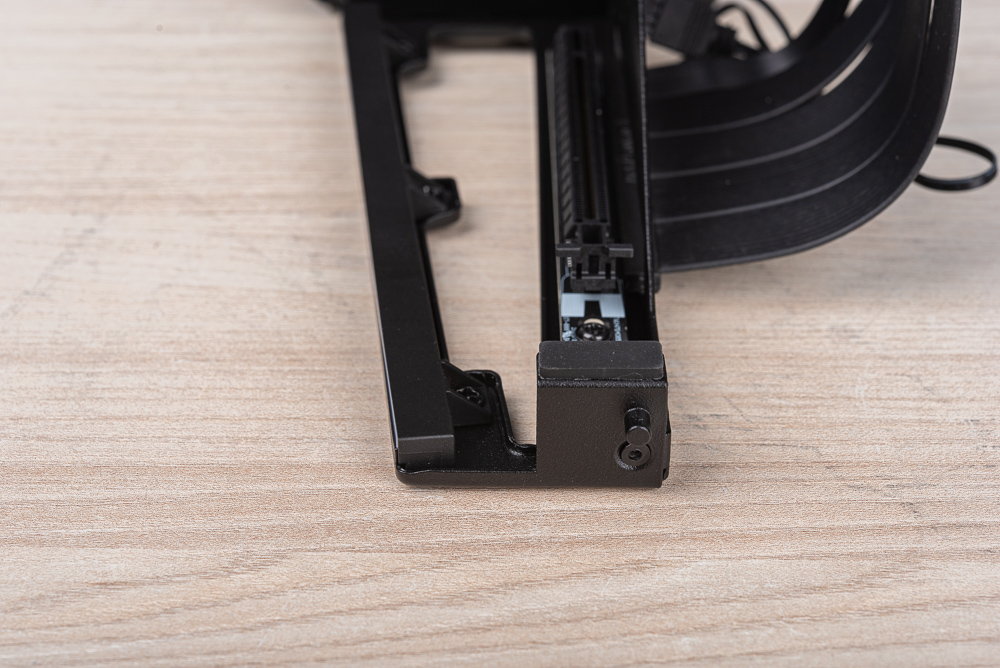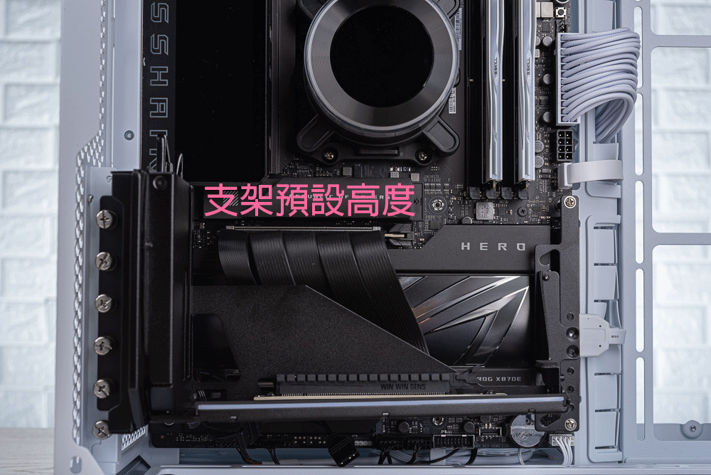 需要注意的是顯卡支架調整到最高,有可能會遇到顯卡的背板與 CPU 水冷頭干涉;而當支架調整到最低時,機殼底部會無法安裝風扇。畢竟顯卡垂直安裝並沒有標準的規格,因此勢必在調整上會有干涉問題需注意。