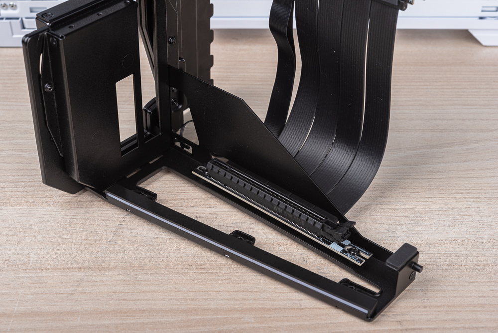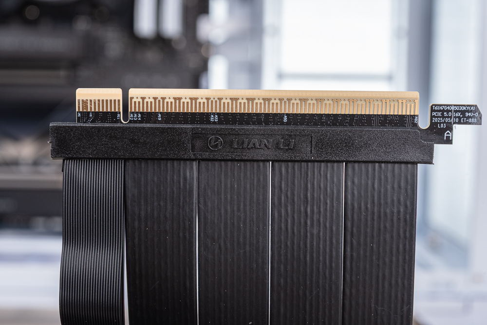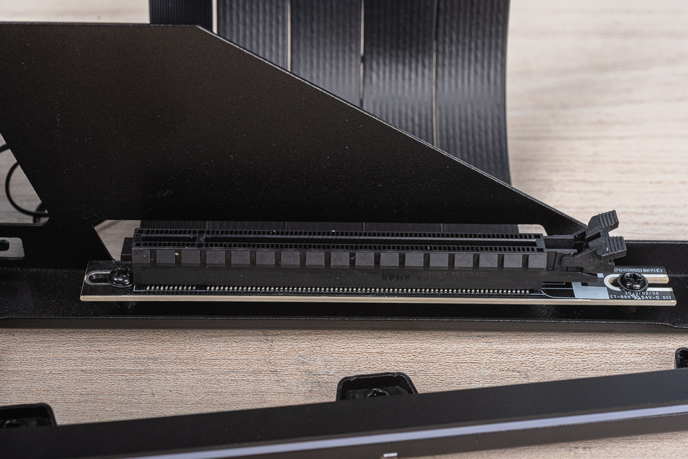 PCI-E 延長線,則符合 PCIe 5.0 規範、PCIe 5.0 x16 頻寬並保有 PCIe 卡扣,拆卡時記得要將卡扣下壓才能將顯卡拔起。