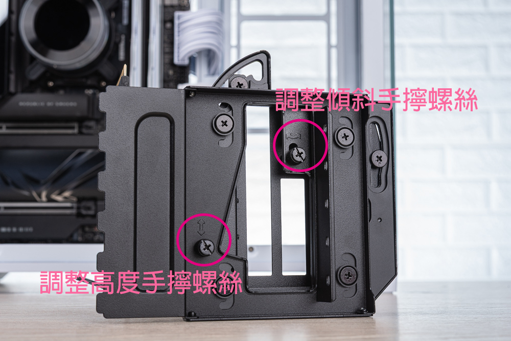 顯卡支架後方,則有著相當有趣的結構設計,實際主要完全鬆開 2 顆手擰螺絲即可調整。調整支架時請將手擰螺絲完全鬆開,調整完畢後再鎖回手擰螺絲固定即可。左下螺絲微調整上下高度、右上螺絲調整傾斜。