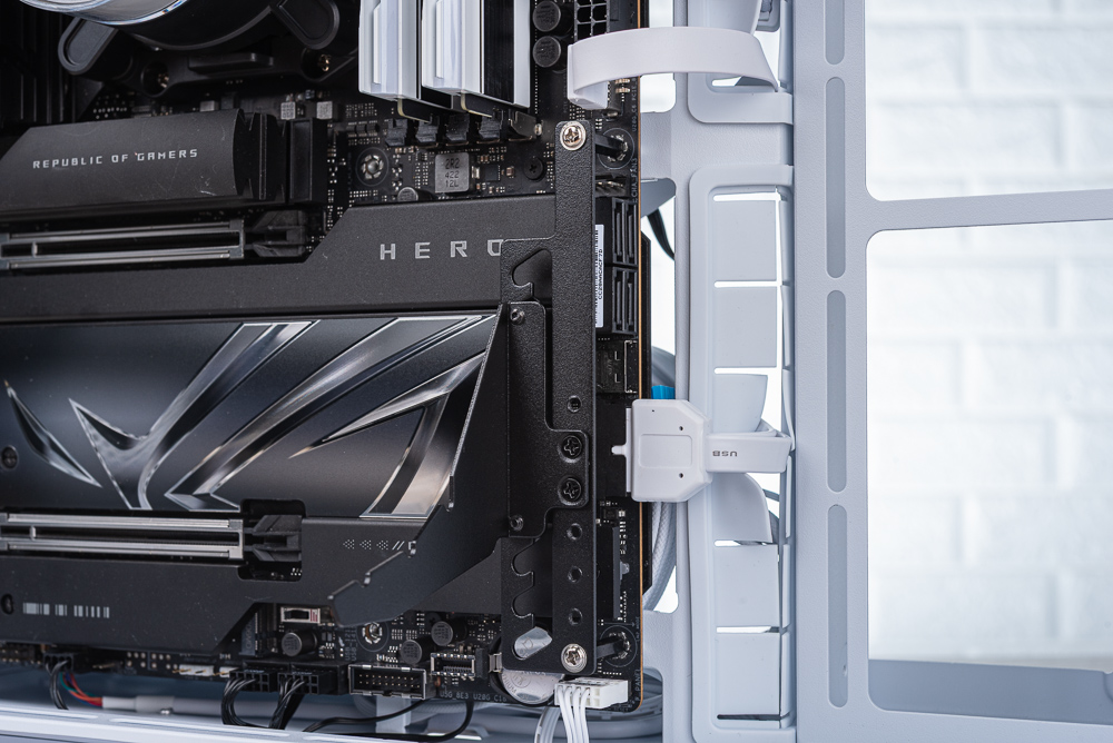 組裝測試則搭配使用 Lian Li O11 VISION COMPACT 機殼,需先將主機板安裝在機殼上,並在主板右下角鎖上顯卡支架的防彎曲支架,藉由兩根銅柱墊高高度後鎖上支架即可。
