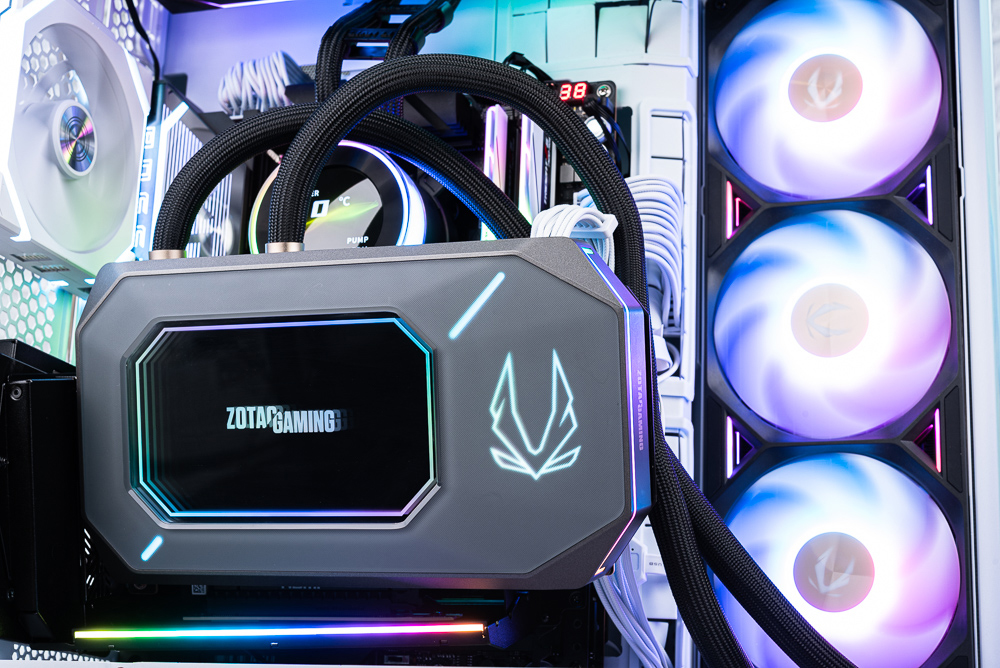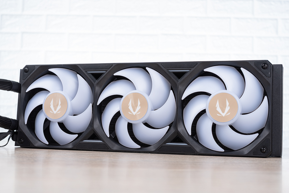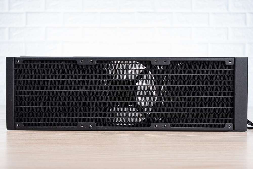 360mm 水冷排預先安裝 3 x 120mm 一體式 ARGB 風扇,預設是出風散熱配置,玩家搭配機殼時也要將顯卡水冷排安裝於機殼出風處。一體式風扇則採用白色扇葉搭配 ARGB 燈效,並在風扇間的扇框也有著 ARGB 燈效。