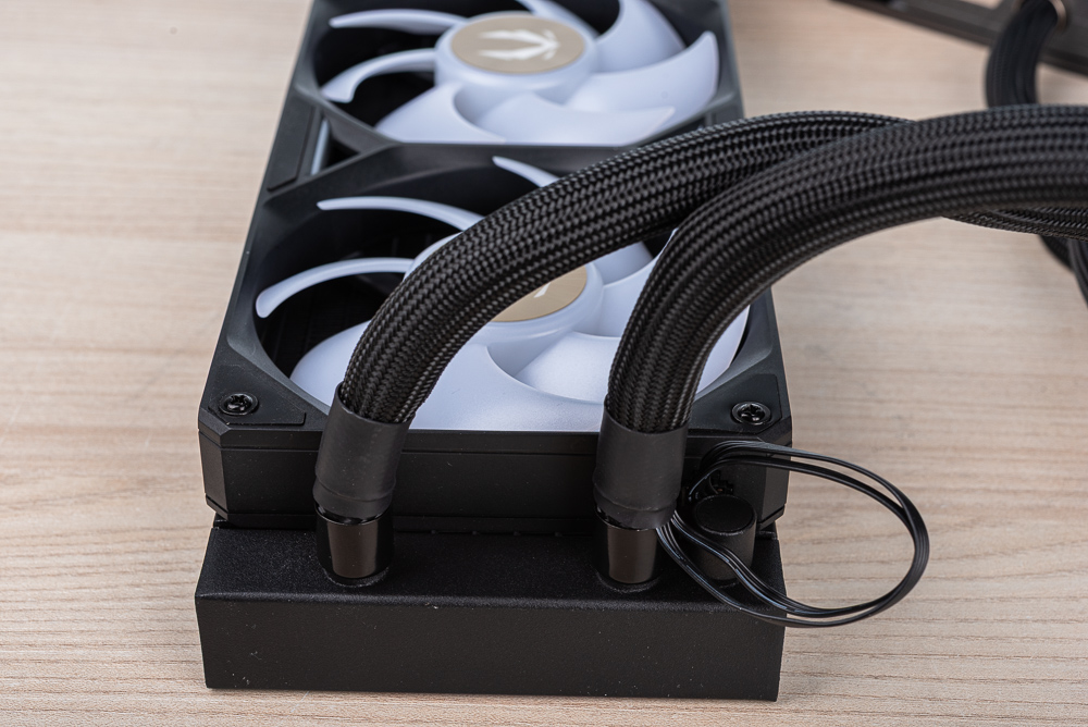 ↑ 水冷排進出水處,風扇的 PWM 與 ARGB 連接線已包進編織網當中。