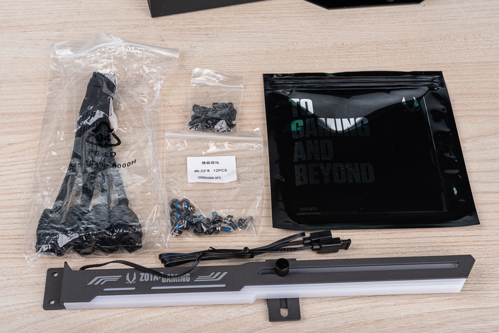 顯卡配件則包含 PCIe 16 Pin 轉接線、水冷排螺絲,以及水平安裝的 ARGB 顯卡支架。