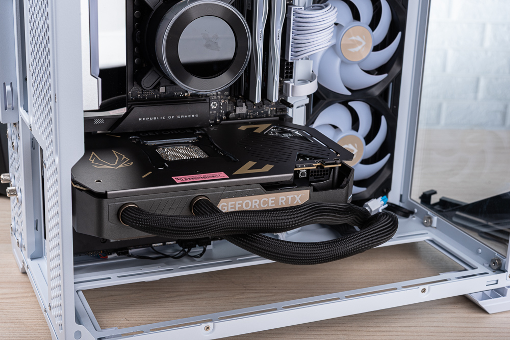 高階顯卡數量有限再加上給出近乎 MSRP 的破天荒價格,讓通路一發出消息馬上被玩家搶購一空。當然這張卡在 DIY 組裝時,建議搭配使用顯卡直立支架,才能展示顯卡正面的燈效,以及有效的規劃水冷管線與水冷排的安裝空間,並請搭配 PCIe 5.0 x16 延長線省去麻煩的 BIOS PCIe 通道設定。