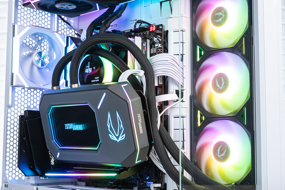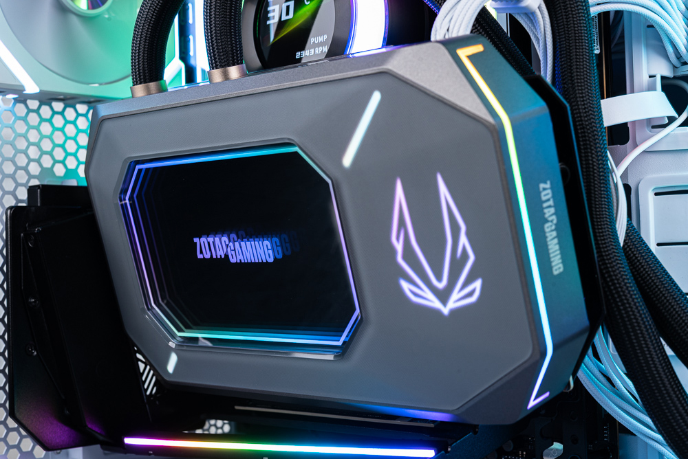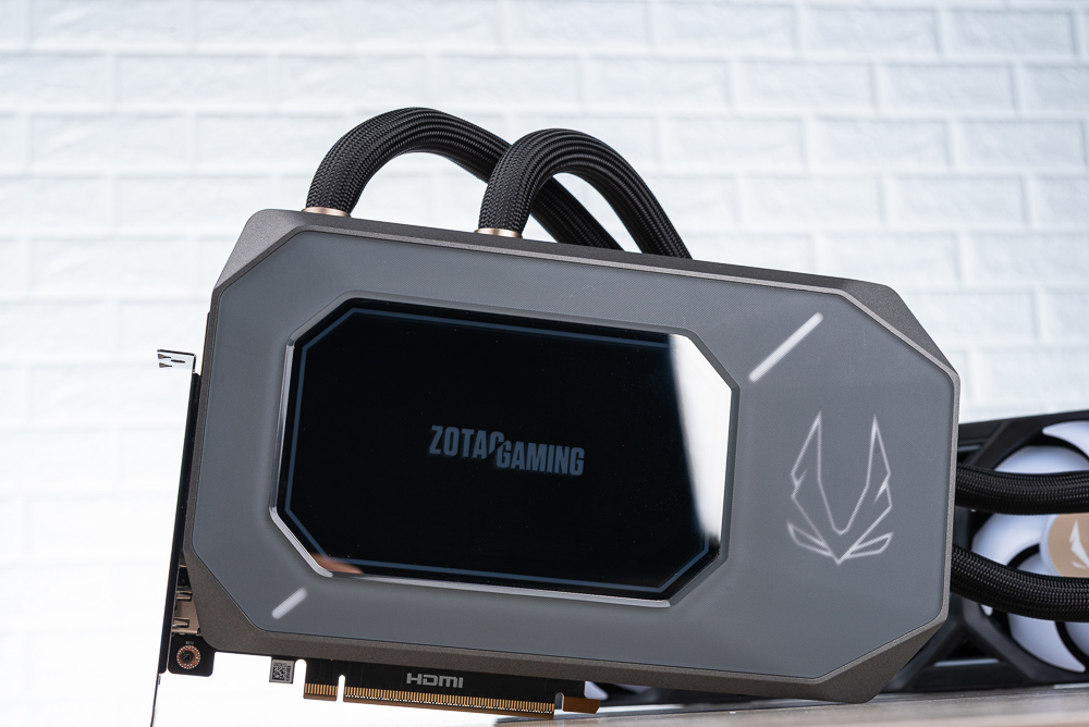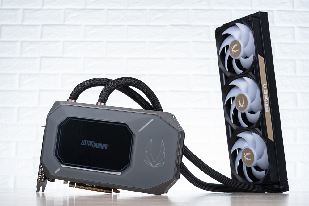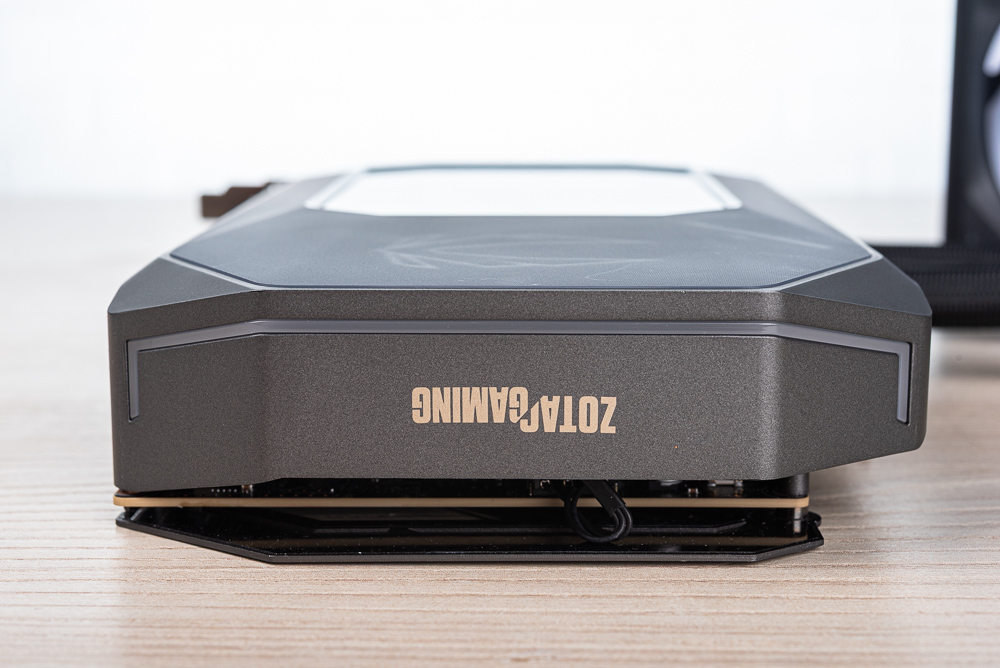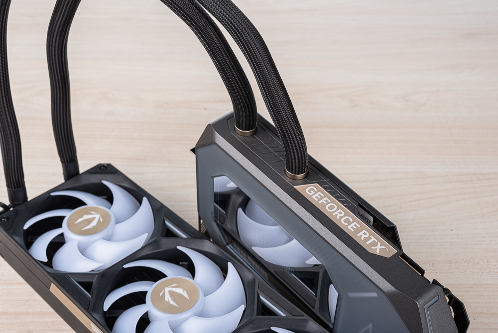 顯卡上方側面則有著水冷進出水的管路,水管長 520mm 並有著編織網包覆。360mm 水冷排加上風善後度來到 55.7 mm,散熱風扇則是 3 x 120mm 一體式 ARGB 風扇,外框有著 ZOTAC GAMING 字樣。