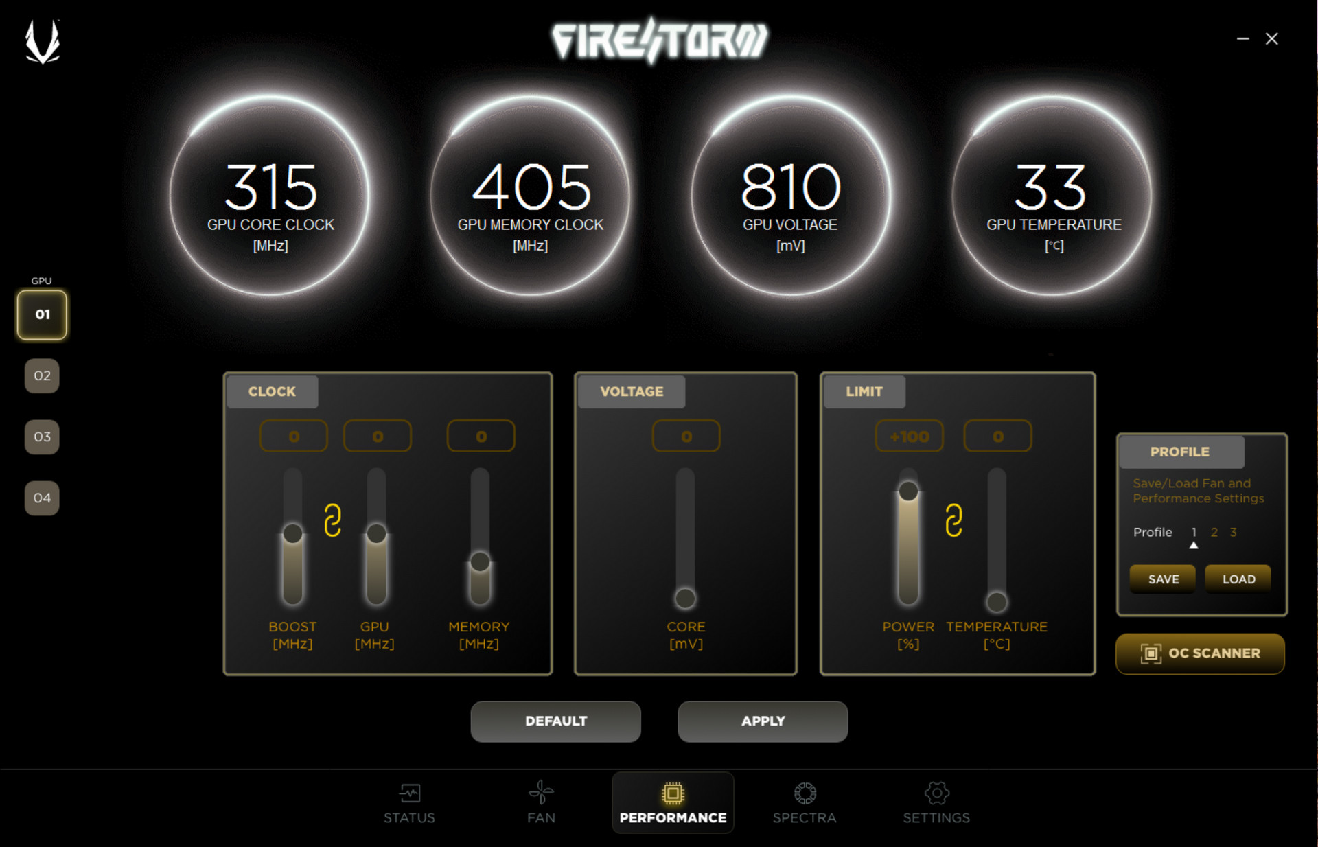 效能設定頁面,可自行調整 GPU 與記憶體時脈、核心電壓、功耗限制等,並提供超頻設定檔與 OC SCANNER 自動超頻等功能。