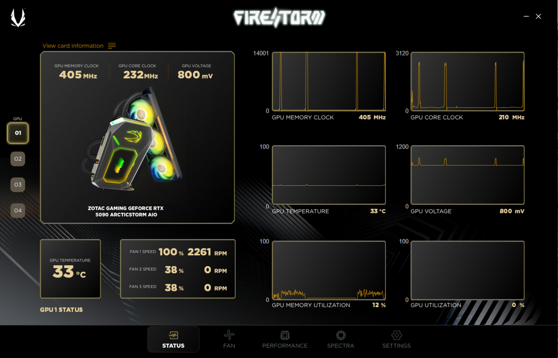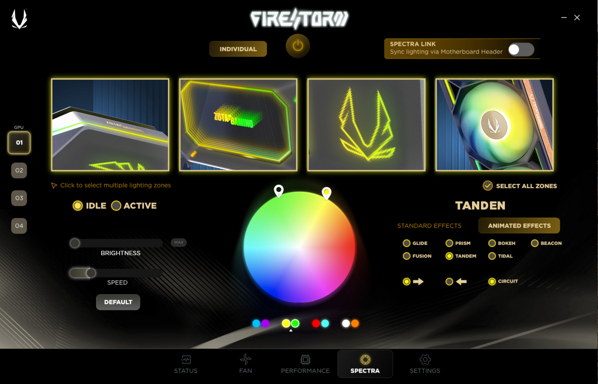 玩家可通過 ZOTAC GAMING FireStorm 軟體來調整顯卡的時脈、電壓、供電,以及監控 GPU、記憶體、風扇等相關資訊,還有著 SPECTRA RGB 燈光效果控制,更支援主板燈效同步等功能。