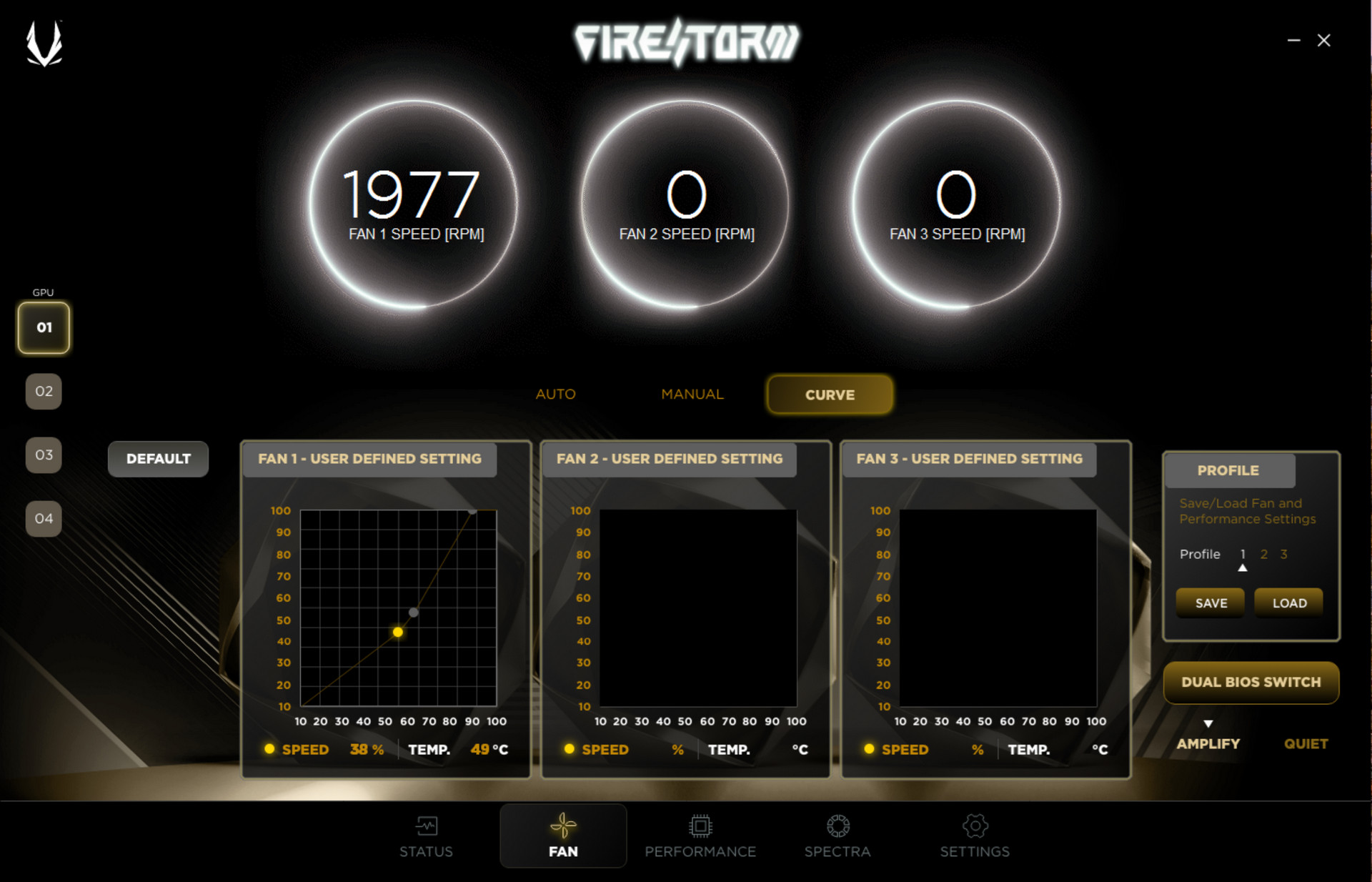 風扇設定,軟體將 3 顆風扇顯示為 FAN 1,玩家可自訂風扇轉速曲線等調整功能;而雙 BIOS 提供的預設風扇轉速限制,也可在軟體中切換。