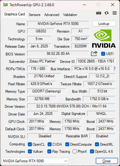 GPU-Z 檢視 NVIDIA GeForce RTX 5090 資訊,採用 5nm 製程的 GB202 GPU,有著 21760 個渲染 CUDA 核心,以及 32768 MB GDDR7(SAMSUNG)記憶體,而 GPU 預設時脈 2017 MHz、Boost 2437 MHz。