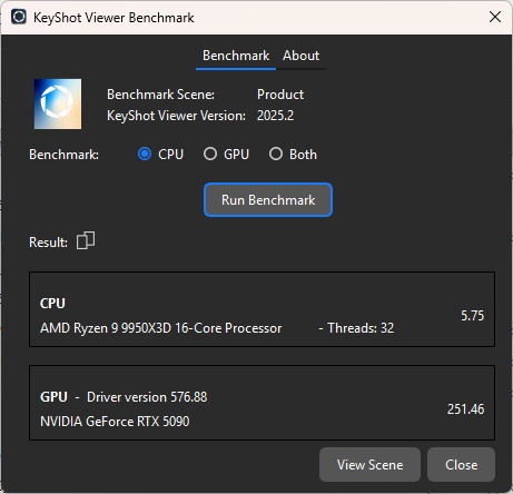 KeyShot 是由 Luxion 所開發的 3D 渲染軟體,能夠快速的建立逼真的 3D 模型影像,並以直覺的介面與即時渲染而出名。KeyShot 預設使用 CPU 進行渲染並支援 GPU 加速渲染等功能,在 KeyShot Viewer 當中提供 Benchmark 功能。KeyShot Benchmark 基準分為 1,測試分數越高代表性能越好。