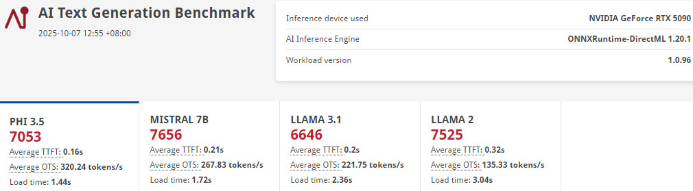 ZOTAC RTX 5090 ArcticStorm AIO、ONNX 引擎,在 Phi-3.5 模型獲得 7053 分 / TTFT 0.16s / OTS 320.2、Mistral-7B 獲得 7656 分 / TTFT 0.21s / OTS 267.8、Llama-3.1 獲得 6646 分 / TTFT 0.2s / OTS 221.75、Llama 2 獲得 7525 分 / TTFT 0.32s / OTS 135.3。