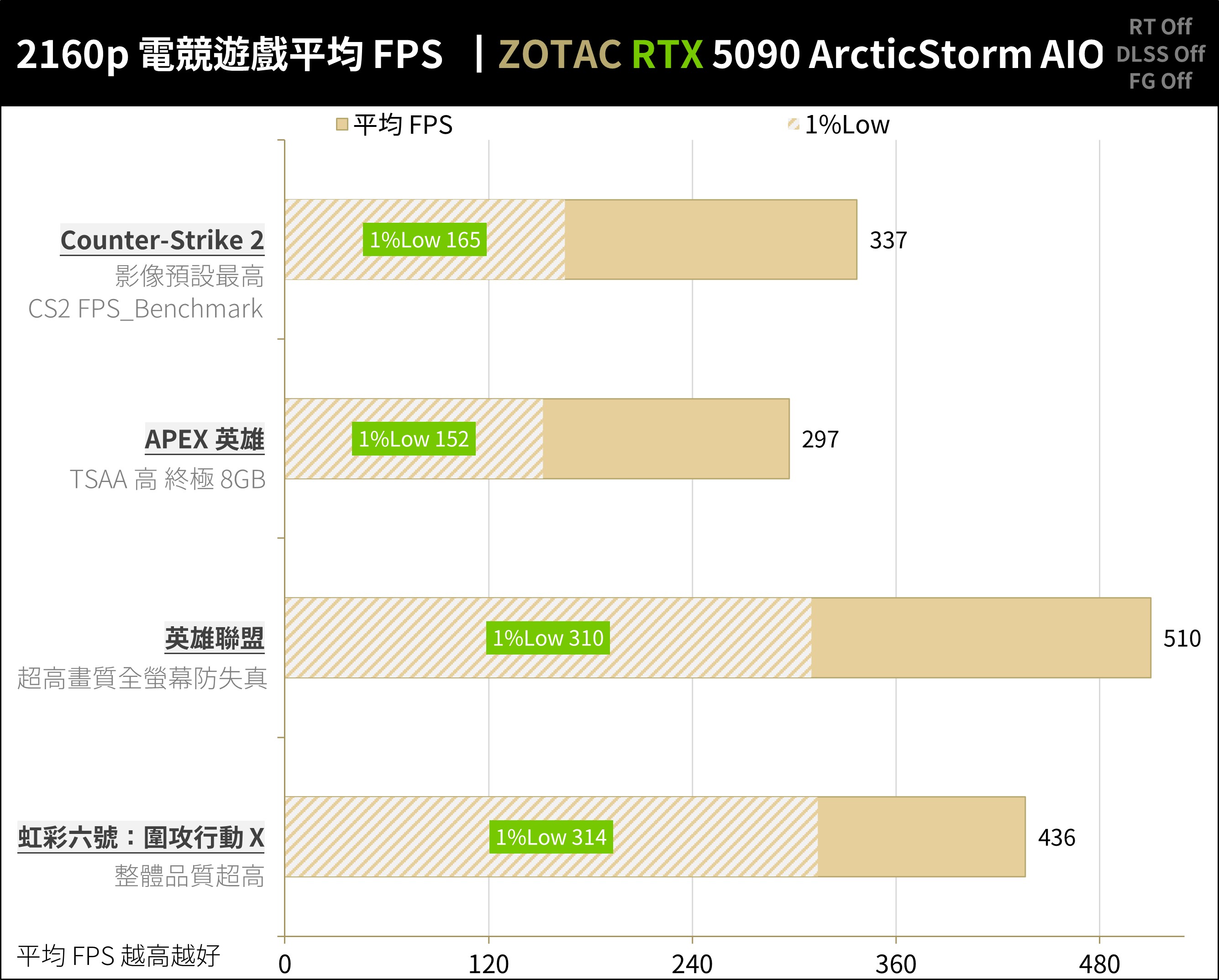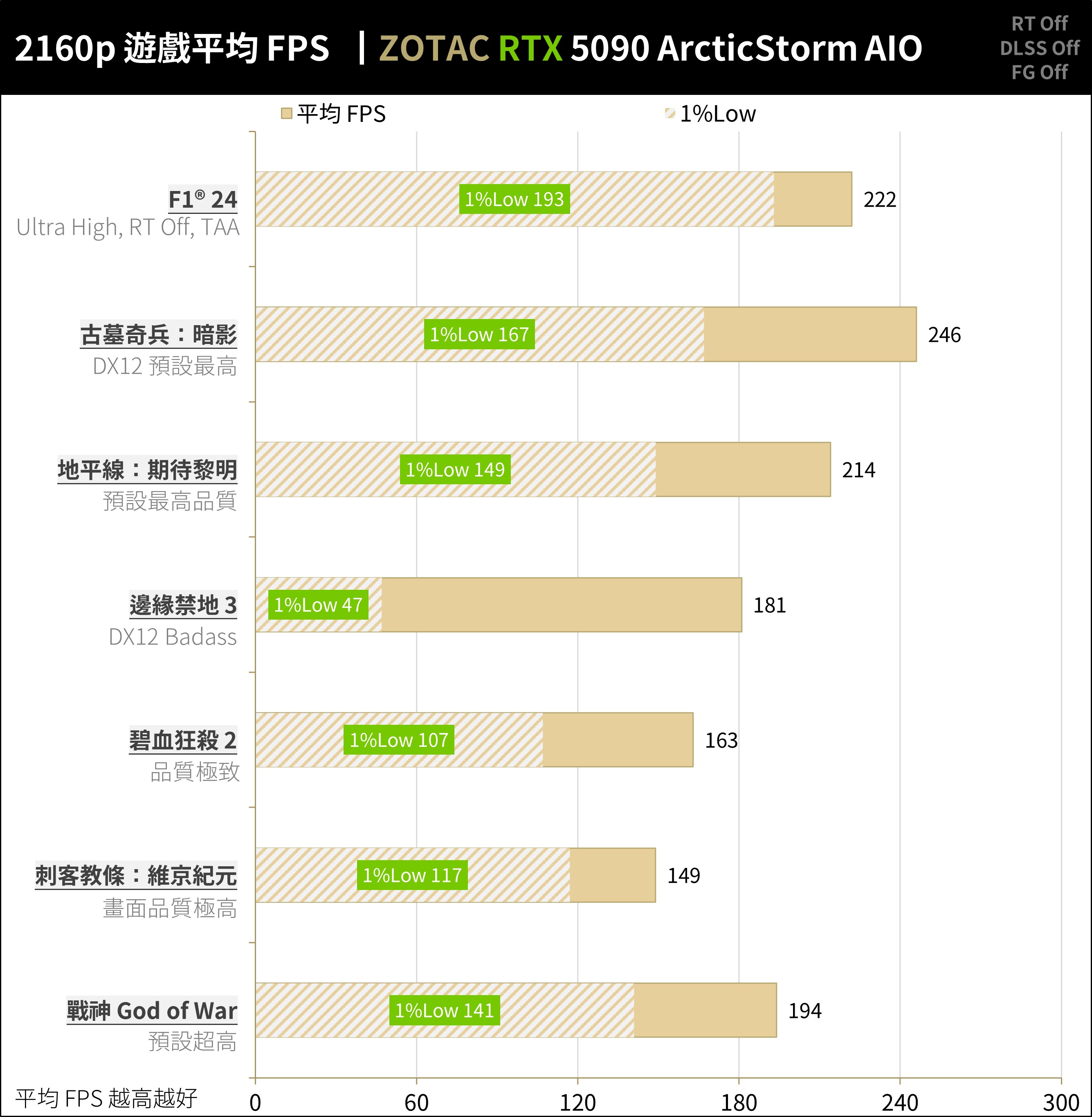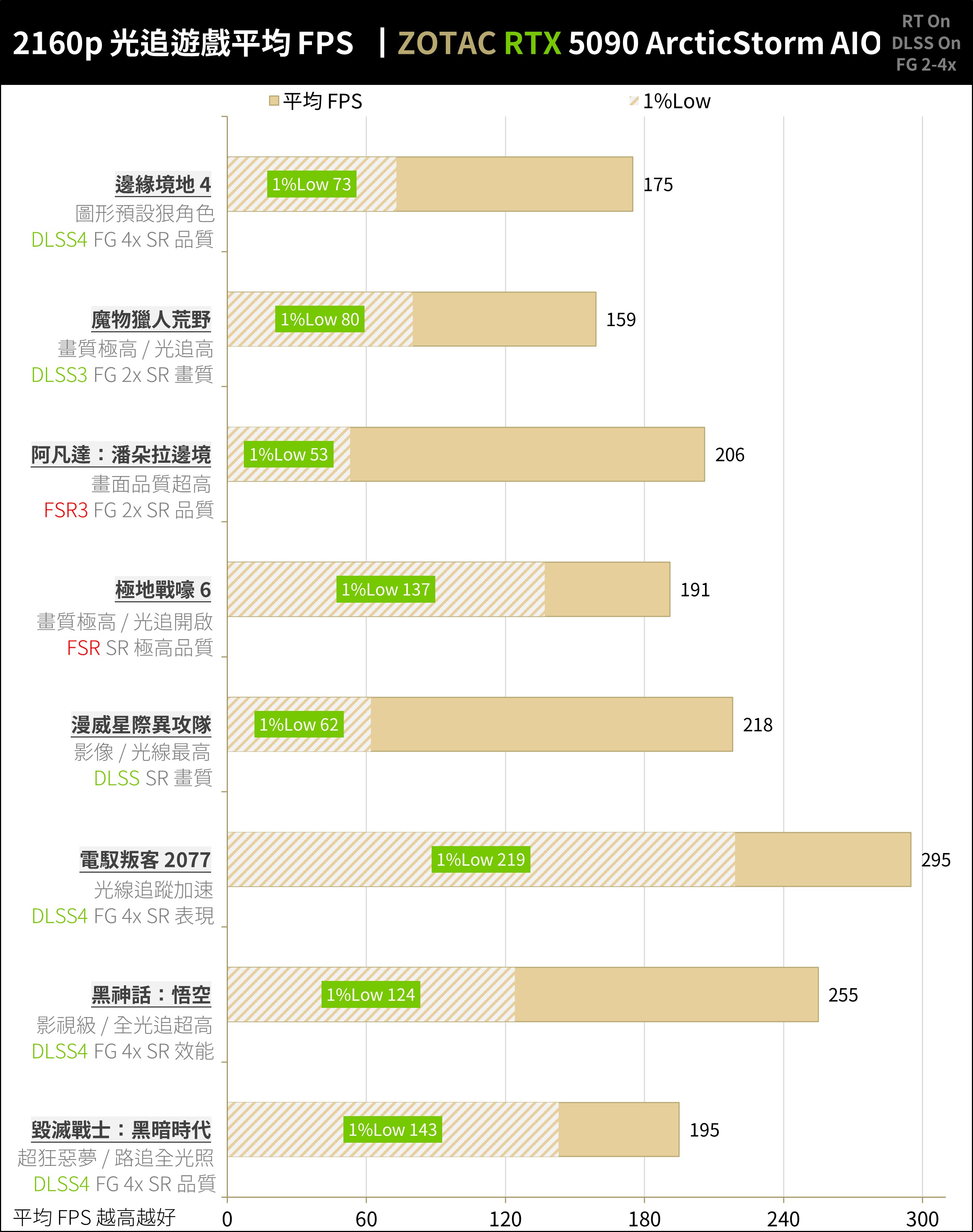ZOTAC RTX 5090 ArcticStorm AIO 在 2160p、不追光不加速的 AAA 遊戲中達到平均 195.5 FPS / 1%Low 131.5 FPS 的效能;對於一般 AAA 遊戲玩家可在 4K 解析度下獲得原生解析度渲染的出色效能,即便 1%Low 也有 100+ FPS 以上的表現 。