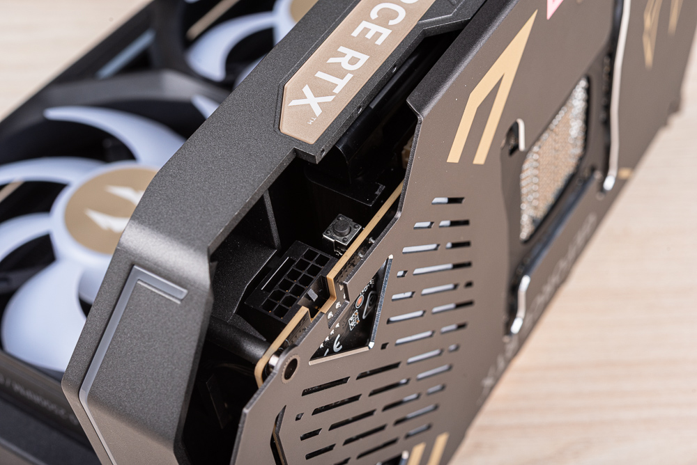 顯卡採用 1 個 PCIe 16 Pin / 12V-2×6 供電;而供電插座一旁還有著按鈕,可以用來切換雙 BIOS 功能,預設為 AMPLIFY 模式性能、散熱優先,另一個模式則是 QUITE 靜音模式。