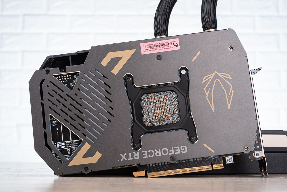 顯卡背面一樣有著金屬背版強化,此外固定全覆蓋銅底水冷散熱器的固定支架也跟著加大,確保顯卡的結構強度。