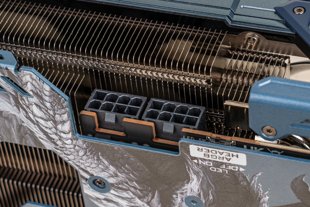 而顯卡供電,採用2個傳統PCIe 8-Pin供電,能兼容 ATX2.0 / ATX3.1 / PCIe 5.1等新舊電源供應器,方便玩家無痛使用;並且在電源插座旁邊,設有 LED On / Off 開關與ARGB 3-Pin接頭,讓玩家開關燈效與連接ARGB設備。