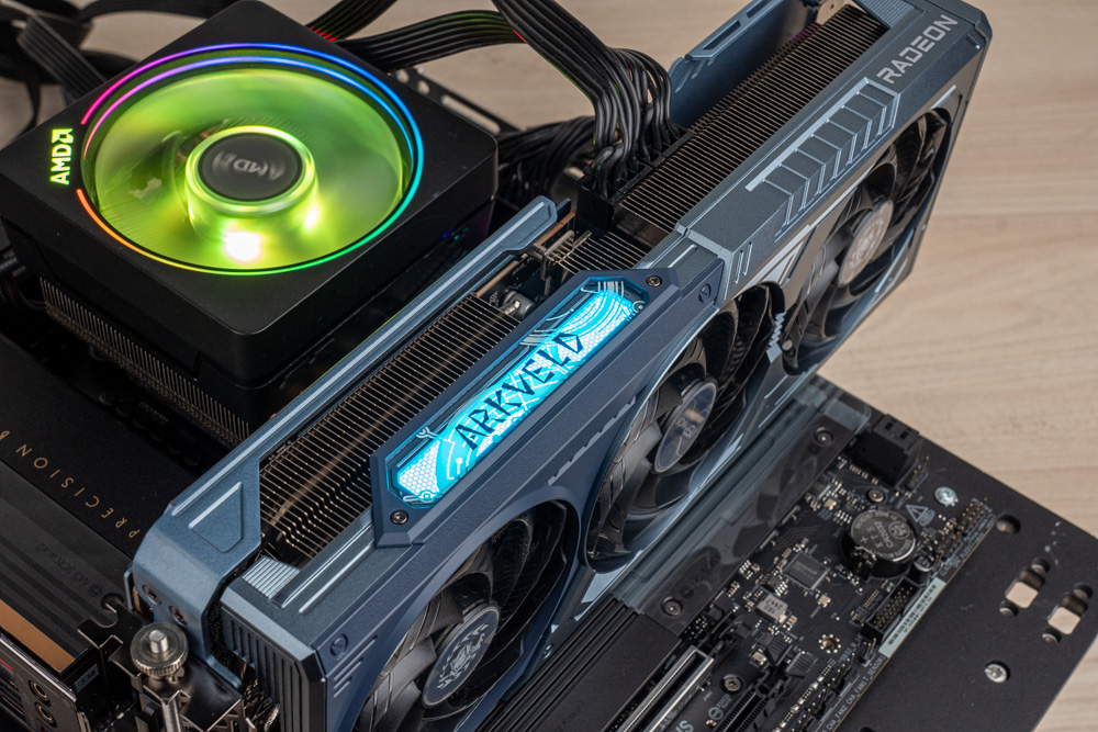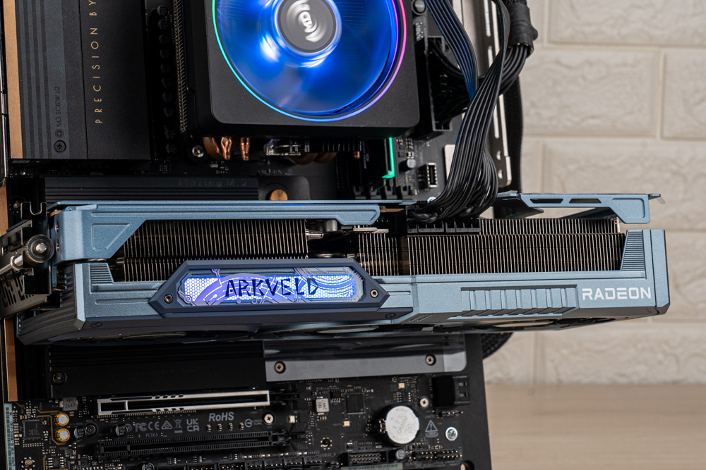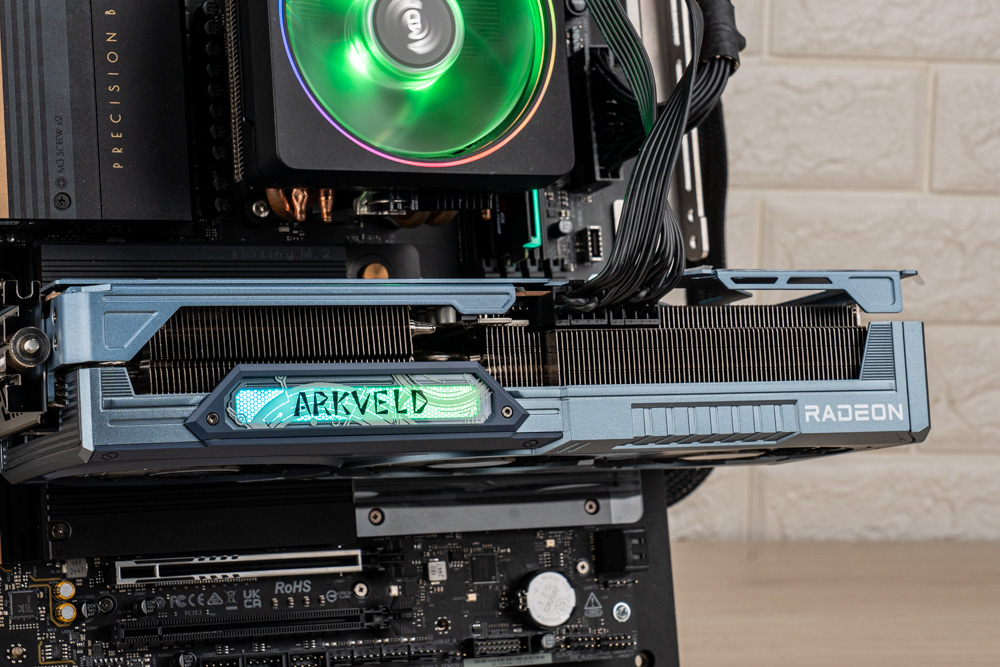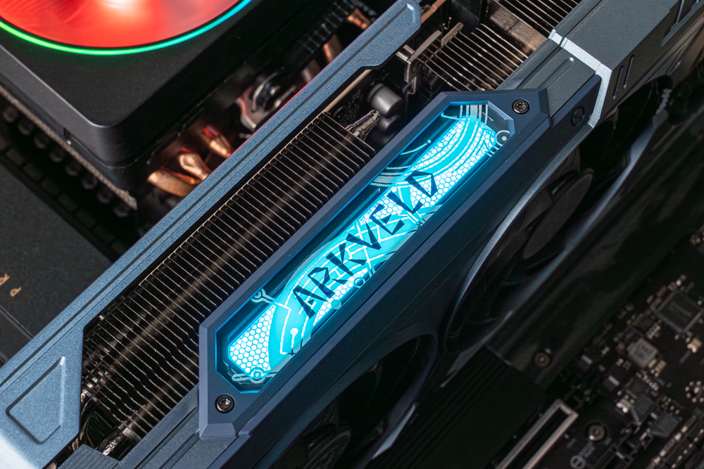 顯卡側面,則有著鎖刃龍專屬銘牌,以遊戲經典的字體與圖紋,標有「ARKVELD」字樣呼應主題,搭配RGB燈板設計,作為顯卡主要的Polychrome RGB燈效。